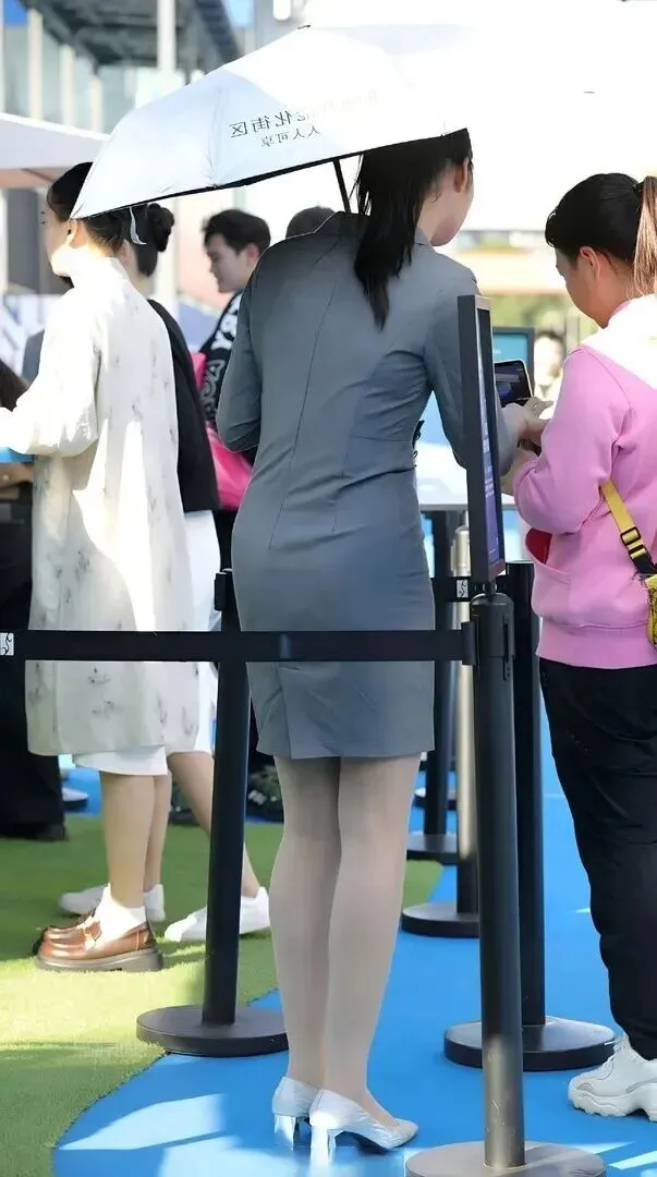 动作也能这样好看,她伸手操作的时候,又是多么地流利、熟练。浅灰色连衣裙、浅肤色丝袜颜色虽浅但带有一种暖意又有着一种专业感。米白尖头浅口高跟鞋起到了画龙点睛的效果,把整个画面都亮了起来。