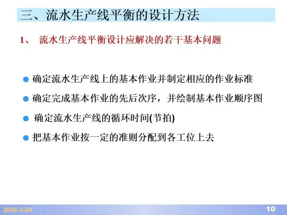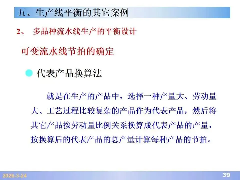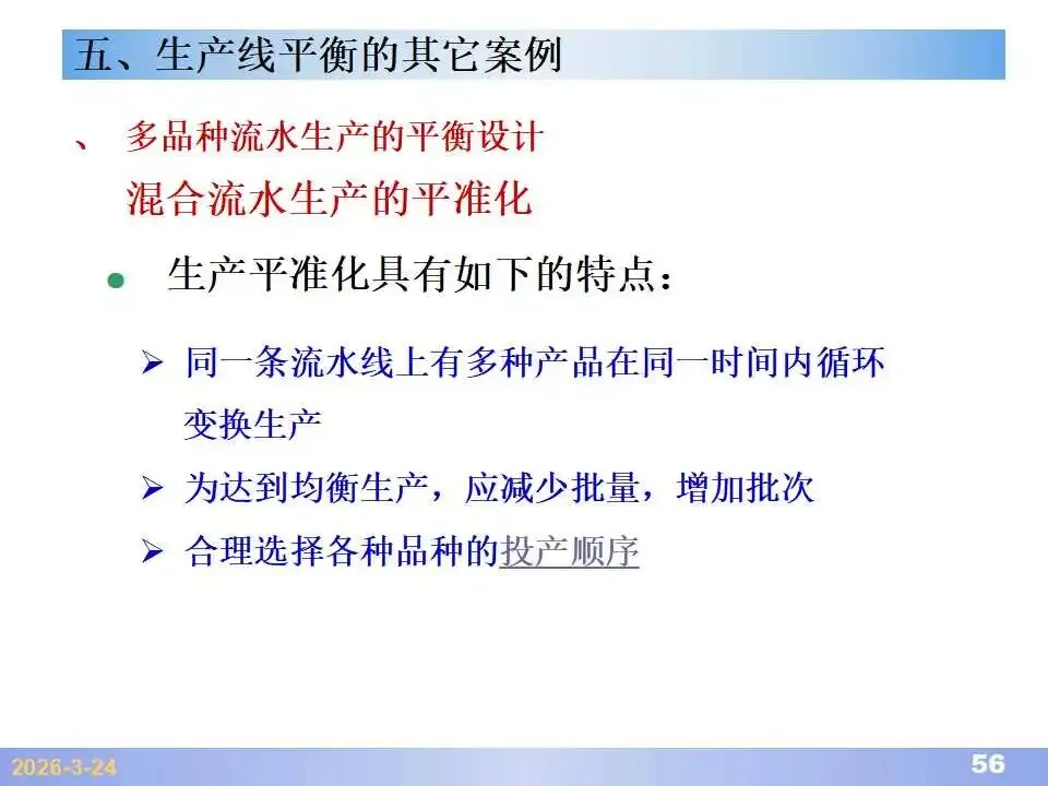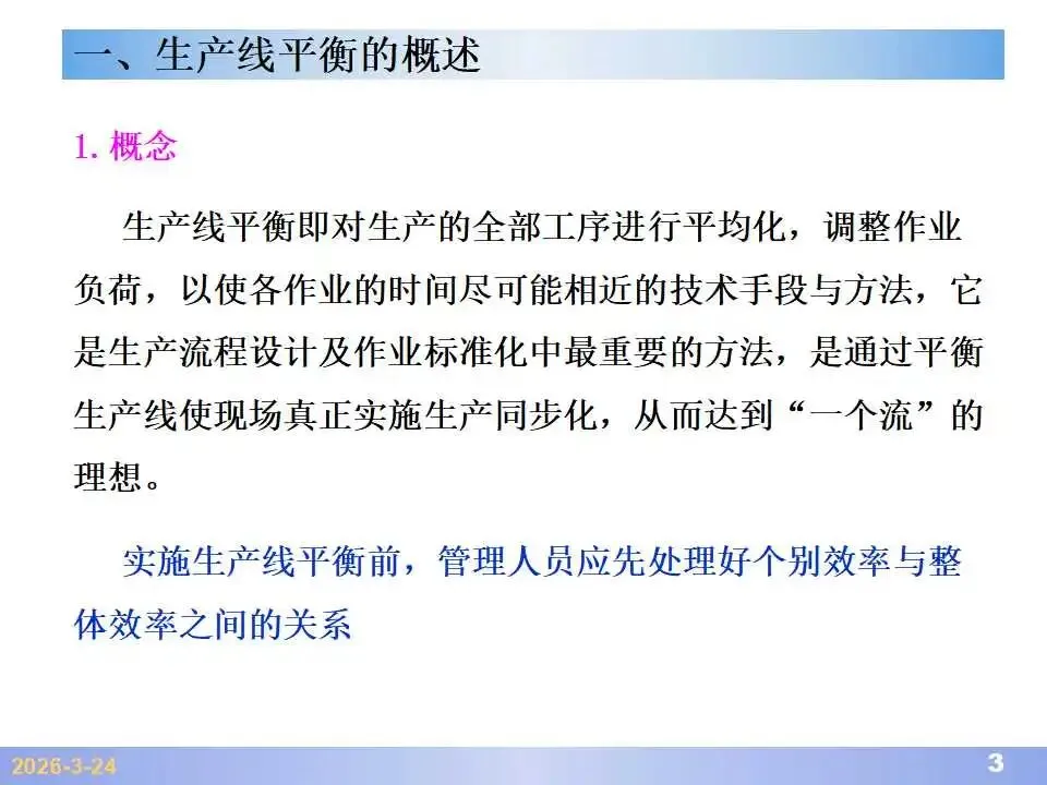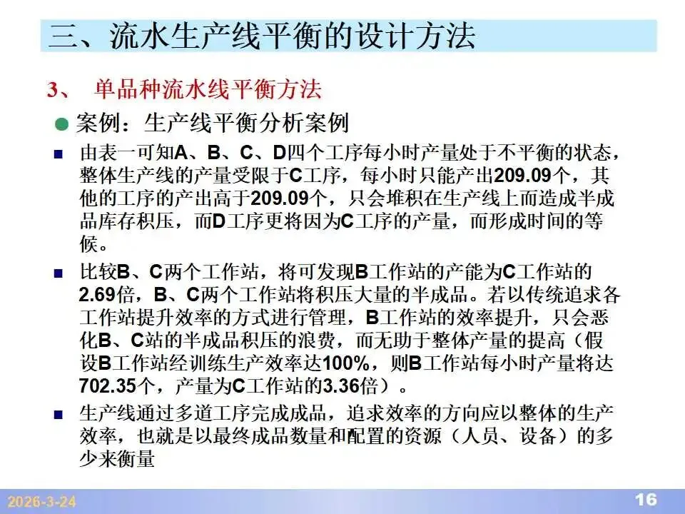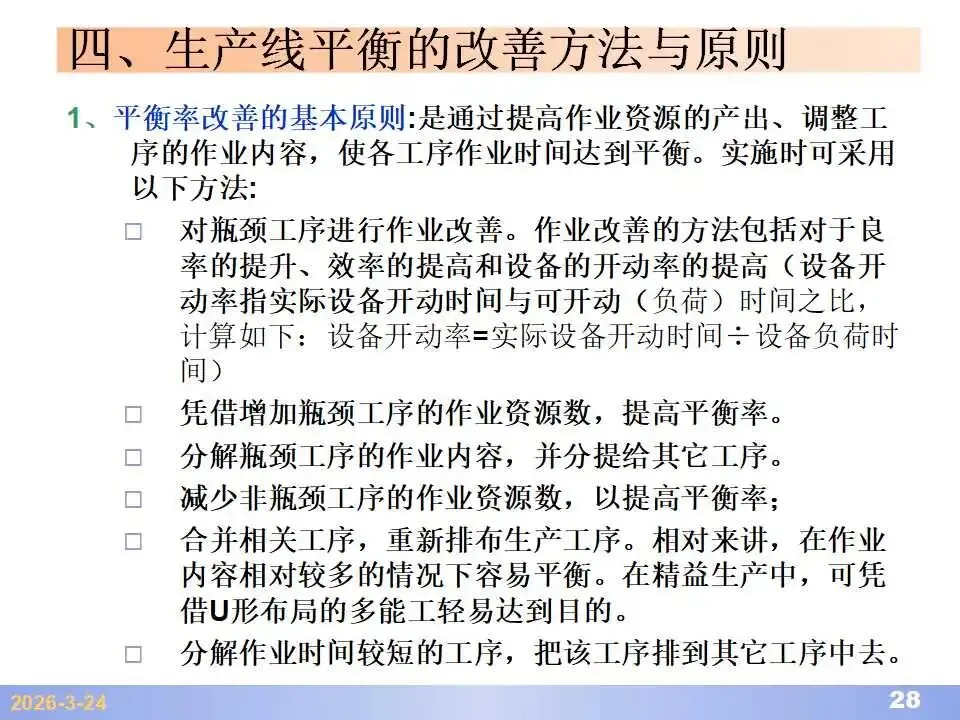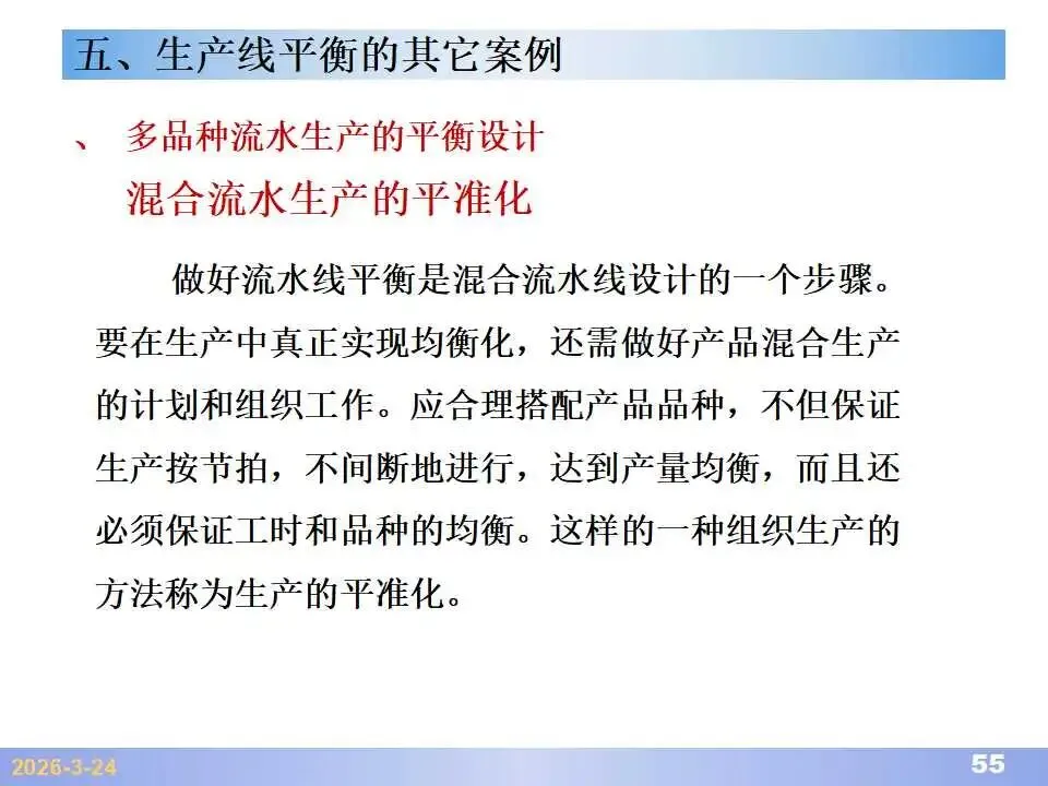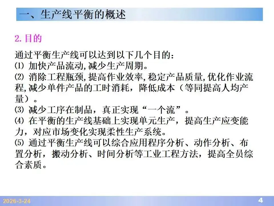 本文系统阐述了生产线平衡的理论基础、分析方法与改善实践,是工业工程(IE)在制造现场应用的重要内容。内容指出,生产线平衡旨在通过调整各工序作业负荷,使作业时间趋于一致,从而实现生产同步化,支撑“一个流”与柔性生产系统的落地。培训首先介绍了流水生产线的类型、组织条件与设计步骤,随后围绕单品种与多品种流水线,详细讲解了节拍计算、平衡图绘制、平衡率与平衡损失率的量化方法,并结合木桶理论、瓶颈识别、工序合并等原则,提出了多种改善策略,如瓶颈工序优化、作业内容重组、资源再配置等。在多品种流水线部分,重点介绍了可变流水线与混合流水线的平衡方法,包括代表产品换算法、劳动量比例分配法、综合作业图构建、生产比倒数法编排投产顺序等。培训强调,生产线平衡不仅是提升效率、缩短周期、减少在制品的关键手段,更是实现柔性制造、平准化生产与持续改善的基础,需要结合动作分析、时间分析、布局优化等IE工具系统推进。