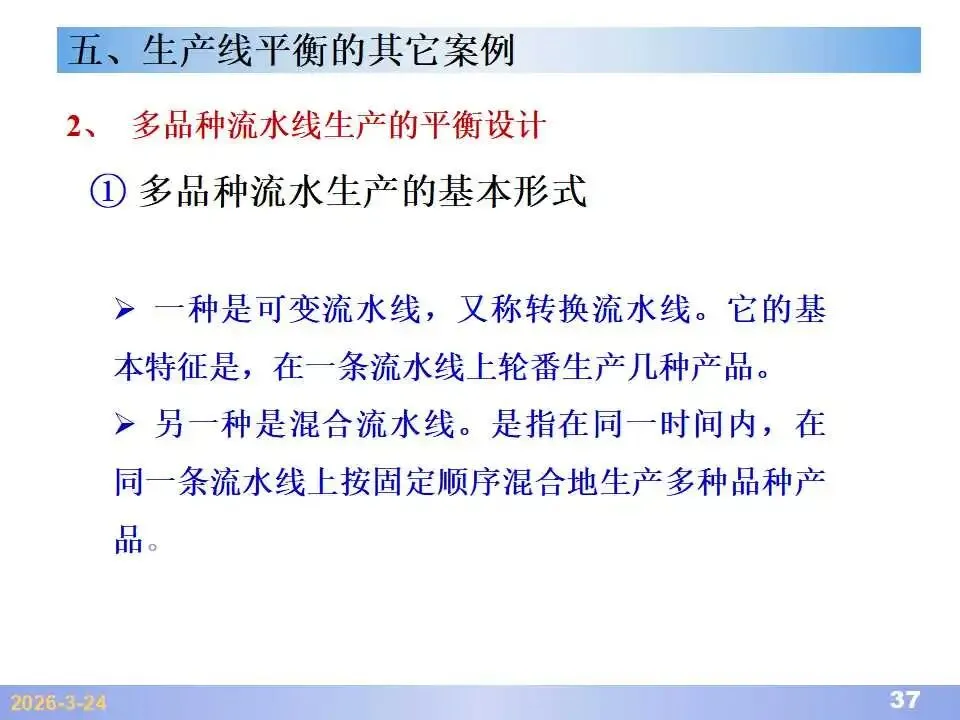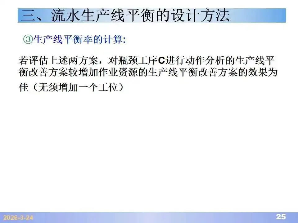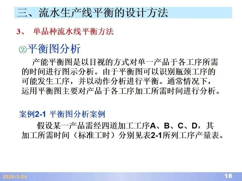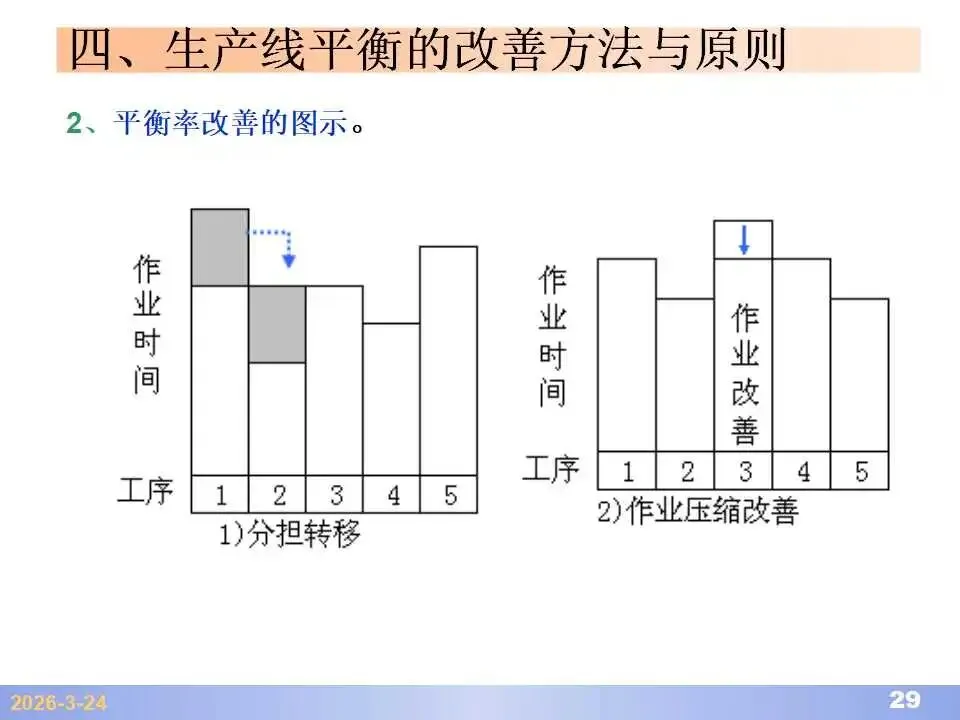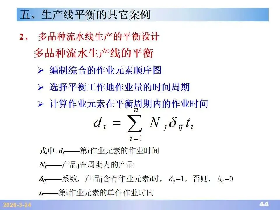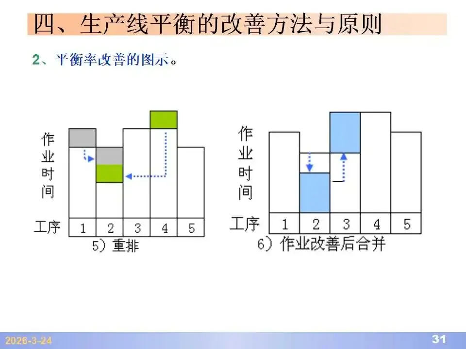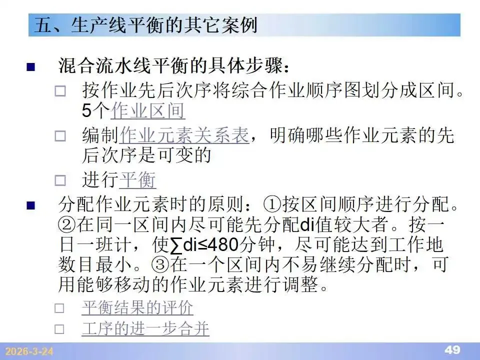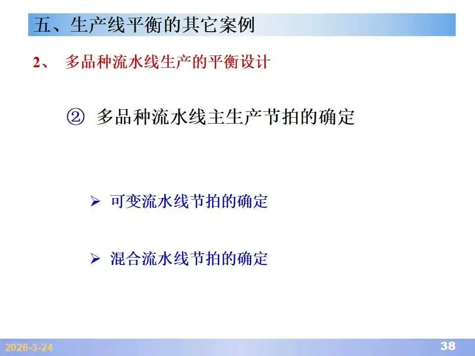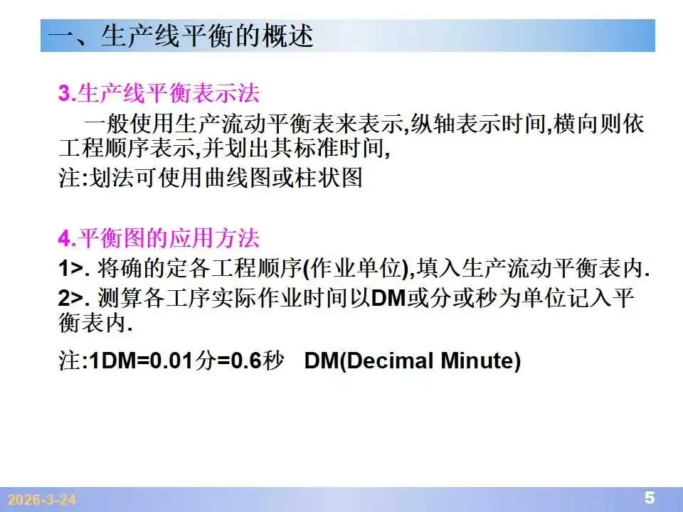 本文系统阐述了生产线平衡的理论基础、分析方法与改善实践,是工业工程(IE)在制造现场应用的重要内容。内容指出,生产线平衡旨在通过调整各工序作业负荷,使作业时间趋于一致,从而实现生产同步化,支撑“一个流”与柔性生产系统的落地。培训首先介绍了流水生产线的类型、组织条件与设计步骤,随后围绕单品种与多品种流水线,详细讲解了节拍计算、平衡图绘制、平衡率与平衡损失率的量化方法,并结合木桶理论、瓶颈识别、工序合并等原则,提出了多种改善策略,如瓶颈工序优化、作业内容重组、资源再配置等。在多品种流水线部分,重点介绍了可变流水线与混合流水线的平衡方法,包括代表产品换算法、劳动量比例分配法、综合作业图构建、生产比倒数法编排投产顺序等。培训强调,生产线平衡不仅是提升效率、缩短周期、减少在制品的关键手段,更是实现柔性制造、平准化生产与持续改善的基础,需要结合动作分析、时间分析、布局优化等IE工具系统推进。