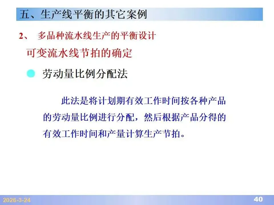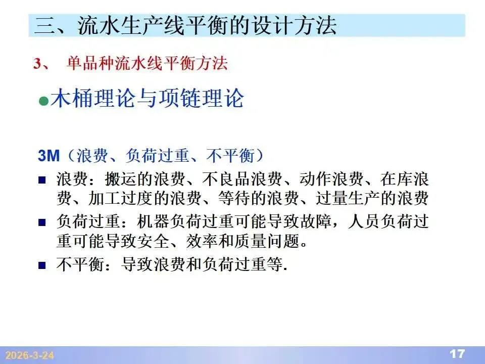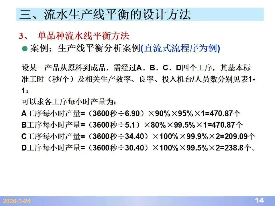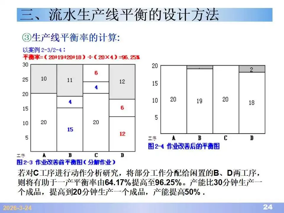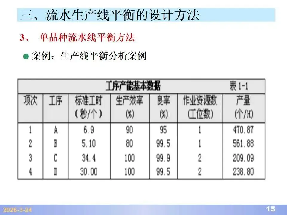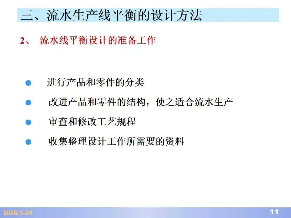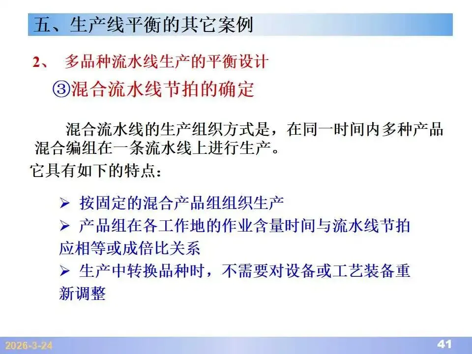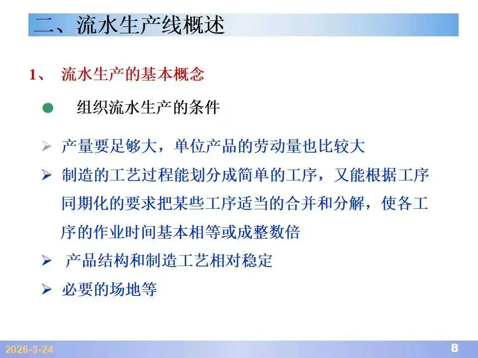 本文系统阐述了生产线平衡的理论基础、分析方法与改善实践,是工业工程(IE)在制造现场应用的重要内容。内容指出,生产线平衡旨在通过调整各工序作业负荷,使作业时间趋于一致,从而实现生产同步化,支撑“一个流”与柔性生产系统的落地。培训首先介绍了流水生产线的类型、组织条件与设计步骤,随后围绕单品种与多品种流水线,详细讲解了节拍计算、平衡图绘制、平衡率与平衡损失率的量化方法,并结合木桶理论、瓶颈识别、工序合并等原则,提出了多种改善策略,如瓶颈工序优化、作业内容重组、资源再配置等。在多品种流水线部分,重点介绍了可变流水线与混合流水线的平衡方法,包括代表产品换算法、劳动量比例分配法、综合作业图构建、生产比倒数法编排投产顺序等。培训强调,生产线平衡不仅是提升效率、缩短周期、减少在制品的关键手段,更是实现柔性制造、平准化生产与持续改善的基础,需要结合动作分析、时间分析、布局优化等IE工具系统推进。