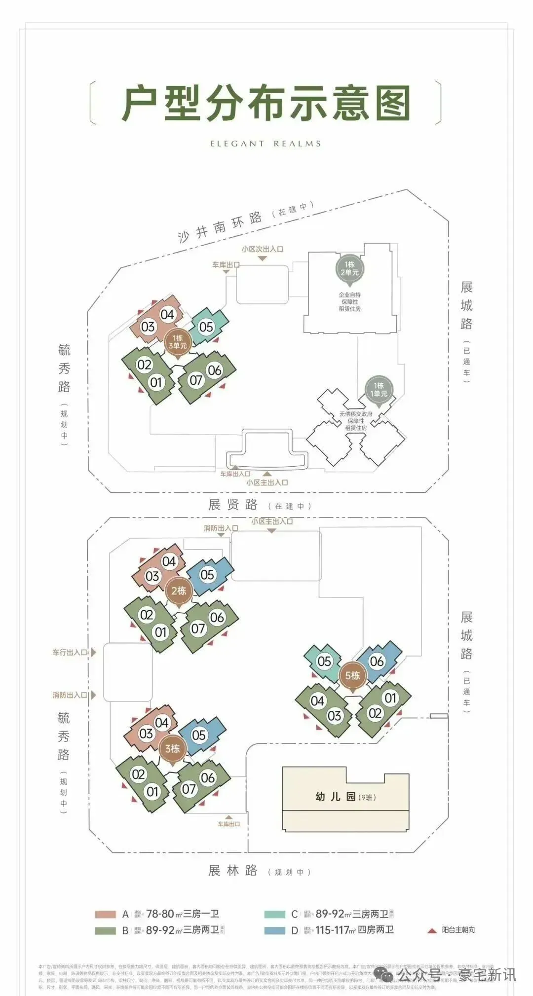 项目占地面积约25246㎡,总建面约169575㎡,共分为两地块开发,规划建设6栋高层住宅,总户数约1534户(其中:商品住宅804户,保障性住房730户),以及1所4层2970㎡幼儿园。据了解,二期将打造约 77-115㎡ 3-4房建筑新规产品,得房率会比周边产品高出不少。住宅面积47795㎡,规划总户数933套(其中商品住宅203套,企业自持保障性住房588套,移交政府保障性住房142套),容积率4.6。其中,1栋共3单元,总层高26-31层,1单元部分为无偿移交政府保障性租赁住房,2单元为自持保障性租赁住房,3单位为纯住宅。住宅面积53495㎡,规划总户数601户(其中套内建面>90㎡89户,<90㎡的512户)。2、3、5栋为纯住宅,总高31-32层,4栋为1所4层2970㎡幼儿园,容积率4.3。招商雍境二期位于沙井街道展城路与南环路交汇处,紧邻地铁12号线海上田园南站。首次推首北地块1栋3单元,约80-92㎡ 3房,共195套,新规使用率高达96%-105%!除了户型的优势外,招商雍境二期还对品质进行了全面升级。项目实拍图