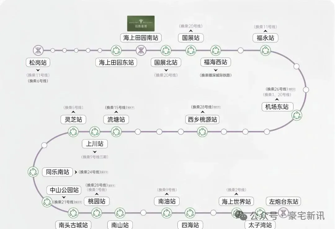 从项目出发,直线距离12号线海上田园南站A出口约100米,1站到国展北可换乘20号线,5站到福永可换乘11号地铁线。
