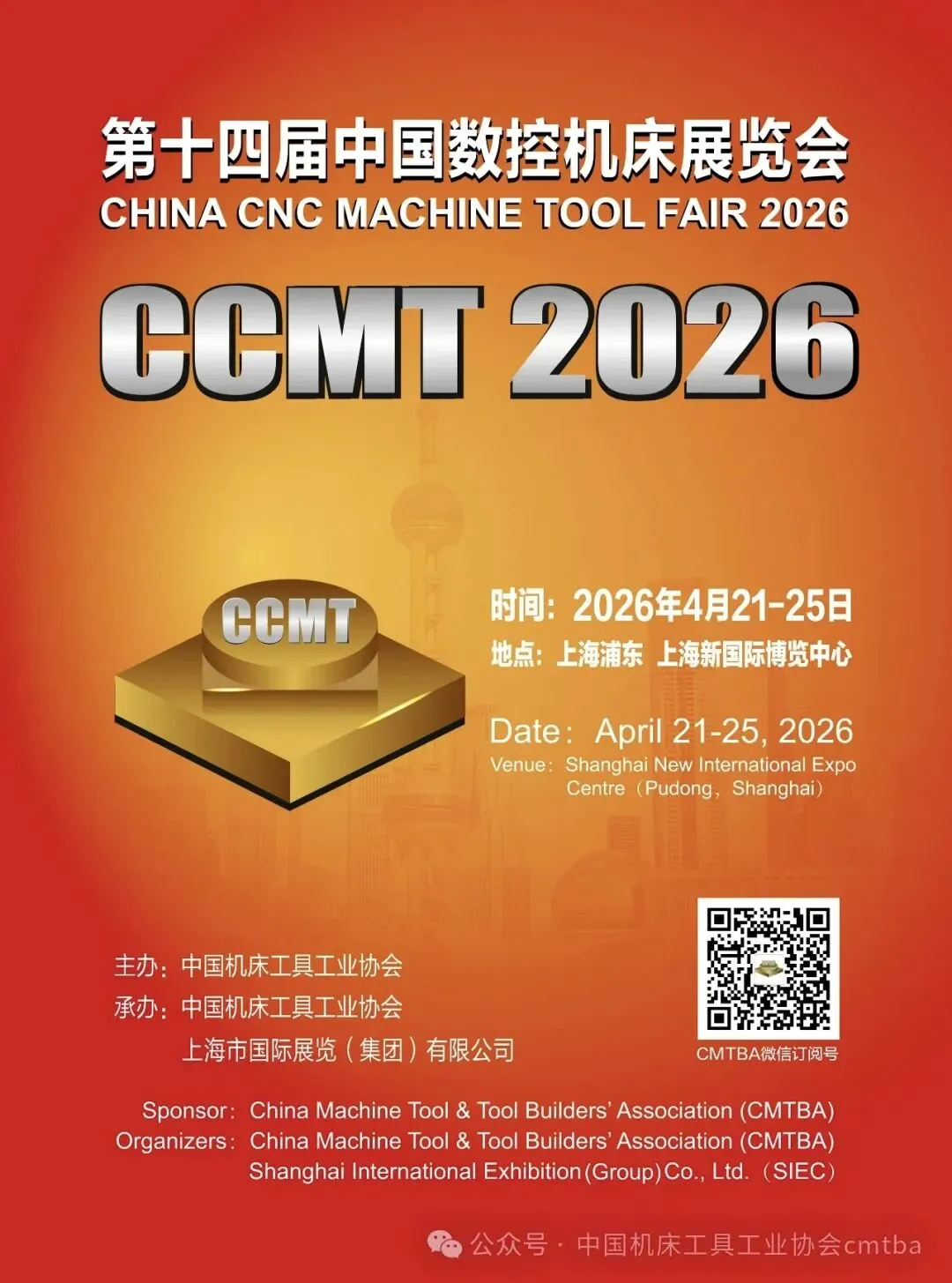 第十四届中国数控机床展览会(CCMT2026)由中国机床工具工业协会主办,并与上海市国际展览(集团)有限公司共同承办,将于2026年4月21-25日在上海浦东•上海新国际博览中心举办。