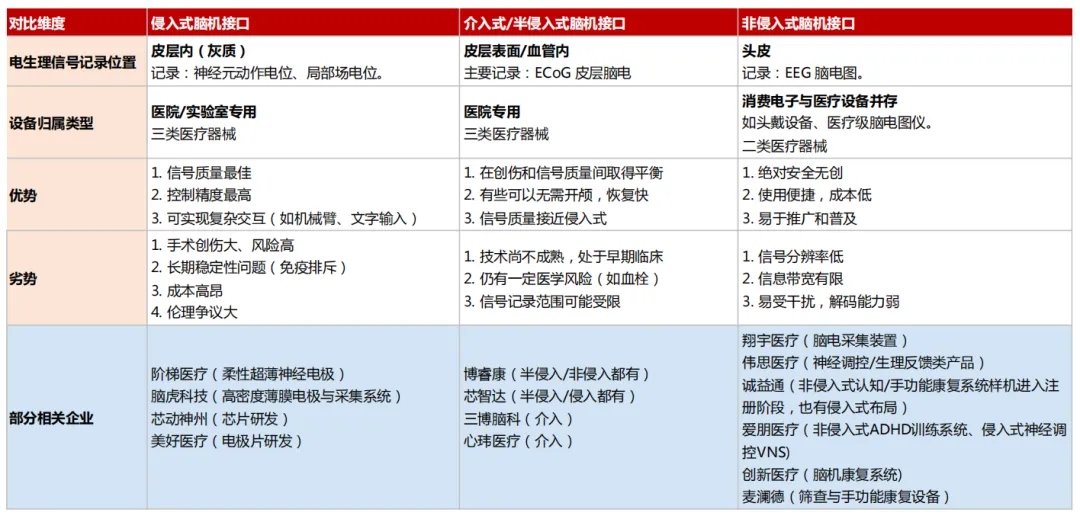 侵入式:用最高的风险换取最佳的性能 ,目标是解决最严峻的医疗难题(如重度瘫痪 )。