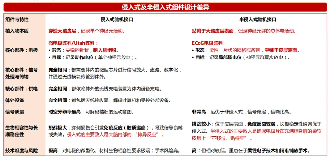 1)半侵入式(植入在硬脑膜上或硬脑膜下)工作流程、系统架构、和核心组件类别上是高度相似的 ,但因为植入位置的重大不同 ,导致了这些组件的具体形态、技术要求和面临的挑战存在显著差异。