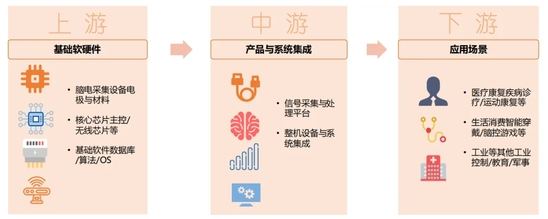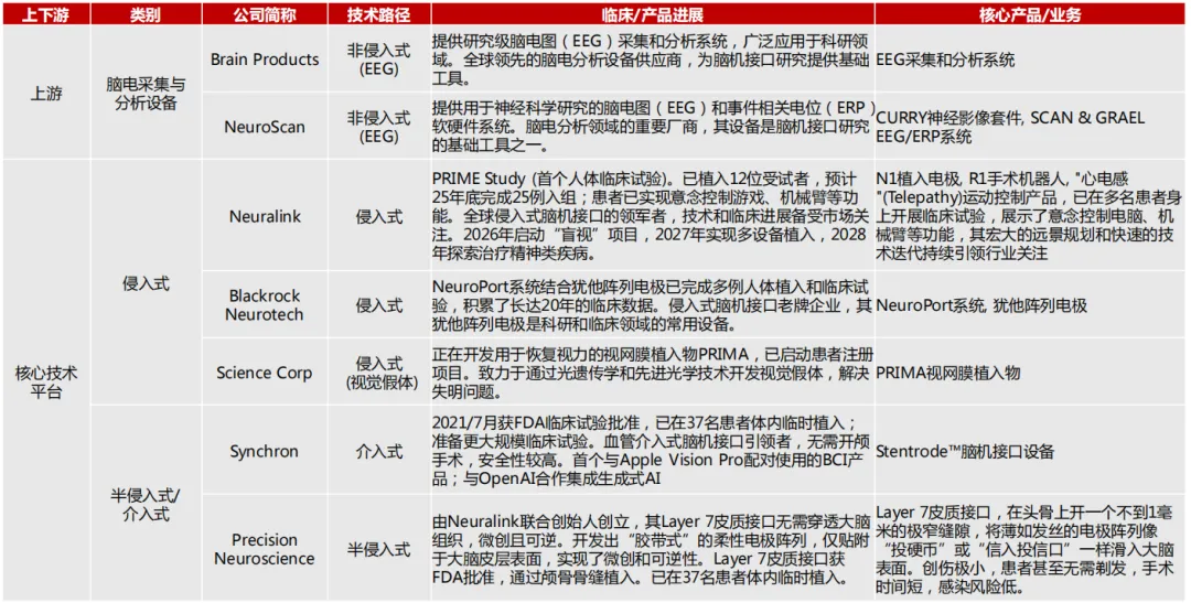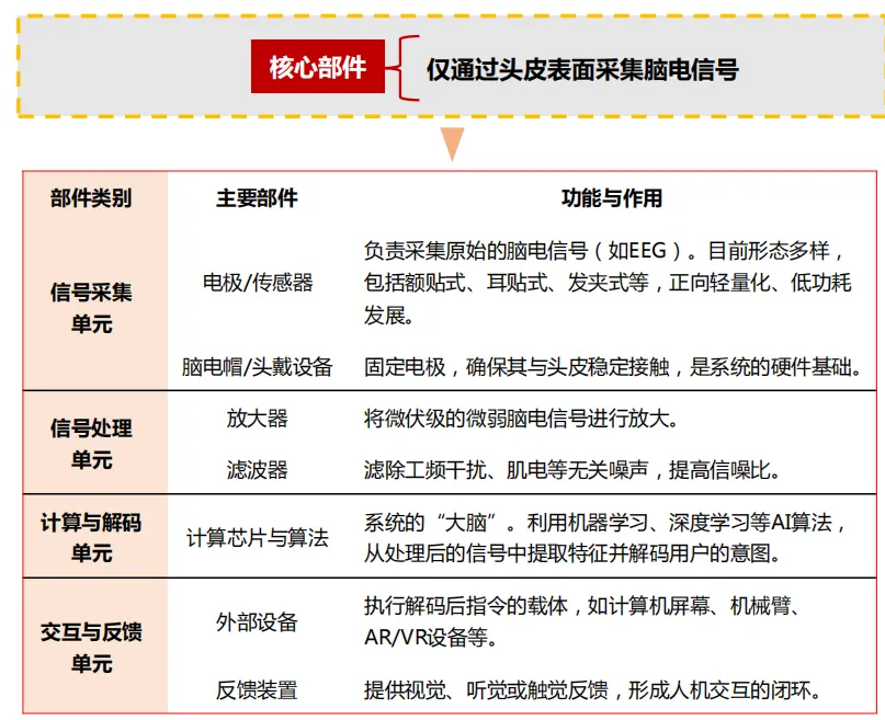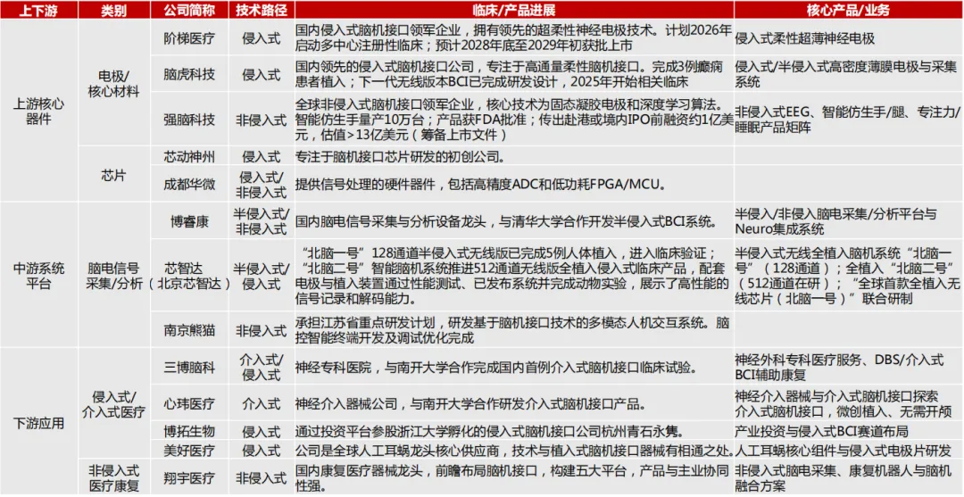 上游:核心元器件和算法是技术基石——主要包括电极、芯片、算法等核心部件,是决定脑机接口性能的关键
