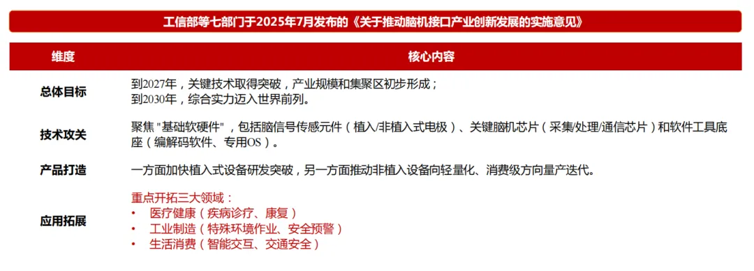 政策强力驱动与顶层设计完善:2025年 ,工业和信息化部等七部门联合发布了 《关于推动脑机接口产业创新发展的实施意见》 ,设定了清晰的产业发展路径和目标。