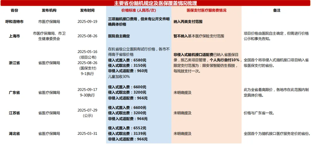 1) 国家医保局顶层设计:2025年3月 ,国家医保局发布了《神经系统类医疗服务价格项目立项指南(试行)》 ,设立了 "侵入式脑机接口置入费"、 "侵入式脑机接口取出费"和"非侵入式脑机接口适配费" 三个核心价格项目 ,为各省定价提供了统一依据。此外 ,国家医保局在2025年9月发布公告 ,面向社会征集包括脑机接口在内的创新医用耗材产品信息 ,加快创新产品的赋码工作 ,这是产品进入医保收费环节的关键一步。