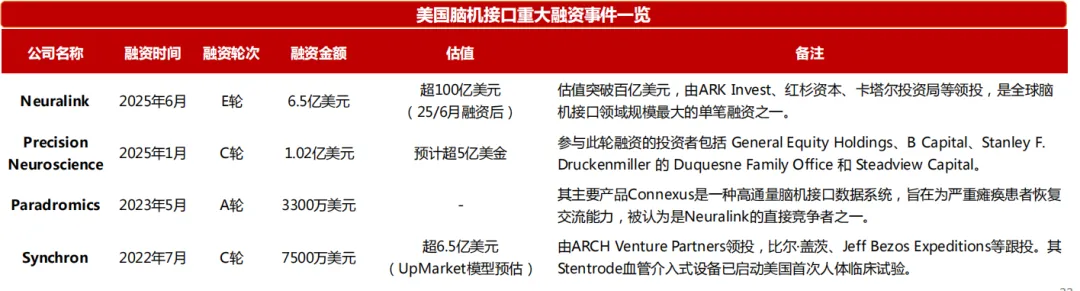 · 侧重颠覆性技术: 资本明显倾向于支持全侵入式技术路线 ,敢于押注高风险、高回报的颠覆性创新。美国在融资体量和单项目估值上遥遥领先 ,拥有定义技术方向和市场的巨头公司。美国资本更偏向于“颠覆式创新”的长期赌注。
