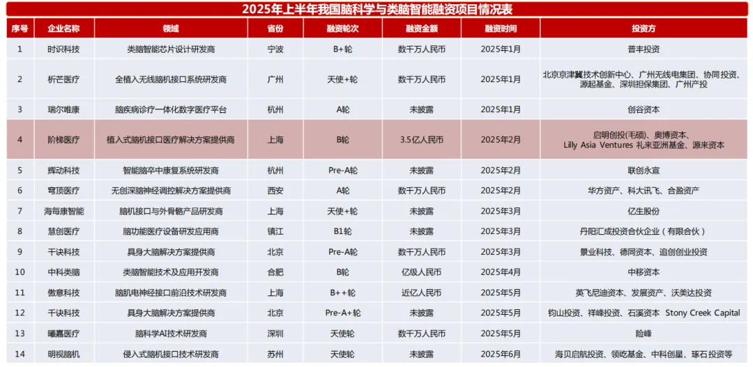 2025年阶梯医疗的3.5亿元人民币B轮融资,创下了国内植入式脑机接口的单笔融资纪录。