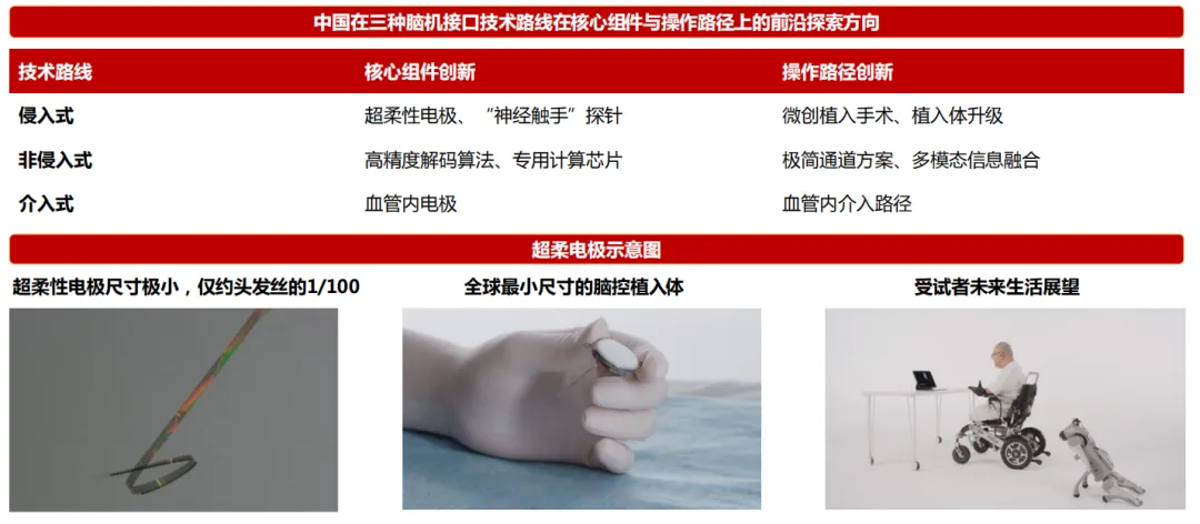 脑机创新——侵入式/非侵入式/介入式的各个组件和操作路径都在探寻更优解决方法。当前的研究在柔性化、微创化和智能化等方面取得了显著进展