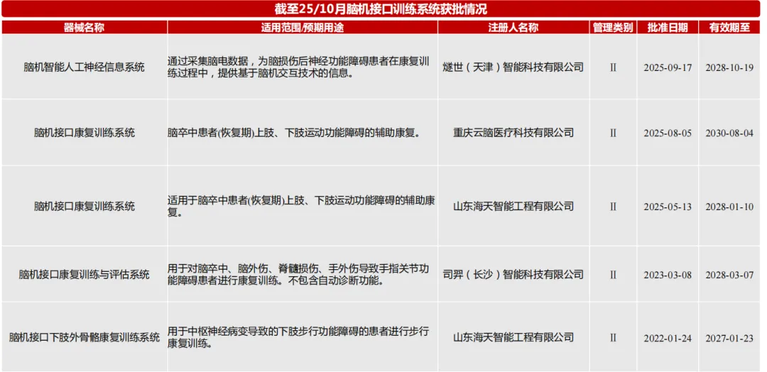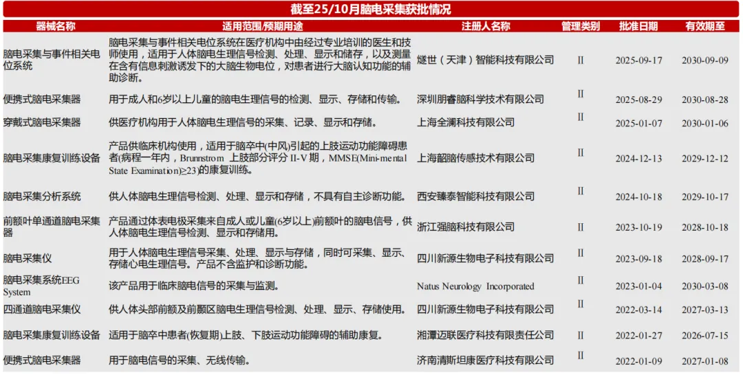 3) 地方积极推动产品化与临床转化: 上海市计划在2027年前 ,推动5款以上侵入式、半侵入式脑机接口产品完成医疗器械型式检验并开展临床试验;到2030年 ,目标是推动系列产品进入医疗器械注册审批阶段。在企业层面 ,以翔宇医疗为例 ,其非侵入式脑机接口相关产品主要申报二类医疗器械注册证 ,并预计在2025年下半年获得多款以"脑机接口"命名的二类证。