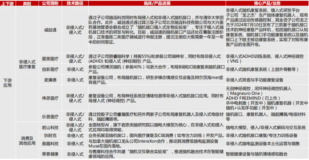 医疗康复领域成为非侵入式技术率先商业化的重要突破口。考虑到运动康复的临床需求明确 ,产品获证难度低、速度快(用于康复训练的脑机接口多采用非侵入式技术路线 ,相比侵入式的技术验证和注册审批时间更短) ,应用场景更加广泛( 医院康复科、社区医院、居家场景 )。例如 ,翔宇医疗的非侵入式脑电采集装置已获二类证 ,计划在2025年推出20-30款康复设备 ,覆盖睡眠障碍、脑卒中后功能恢复等场景。