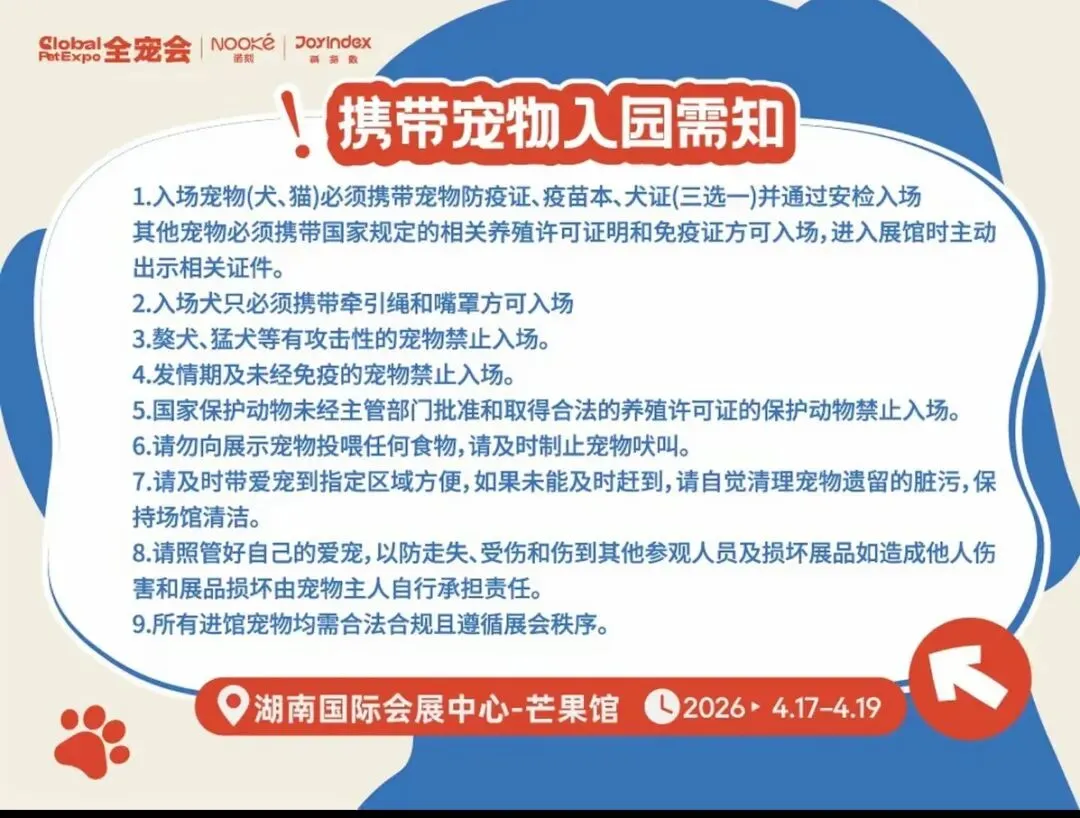 犬猫需携带防疫证/疫苗本/犬证三选一,其他宠物需持养殖许可与免疫证 犬只必须佩戴牵引绳和嘴罩入场 猛犬、发情期、未免疫宠物及无合法手续的保护动物禁止入场 现场需自觉清理宠物污物,照管好爱宠,承担相关责任