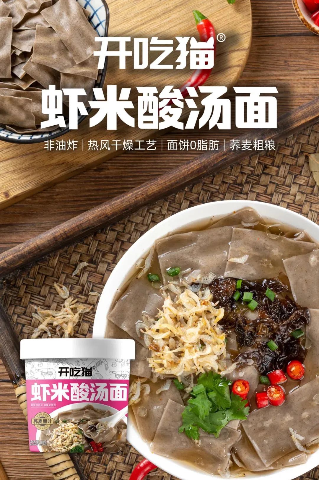 产品介绍:荞麦粗粮、热风干燥技术、非油炸面饼,虾米配紫菜、暖暖酸汤,营养又开胃。