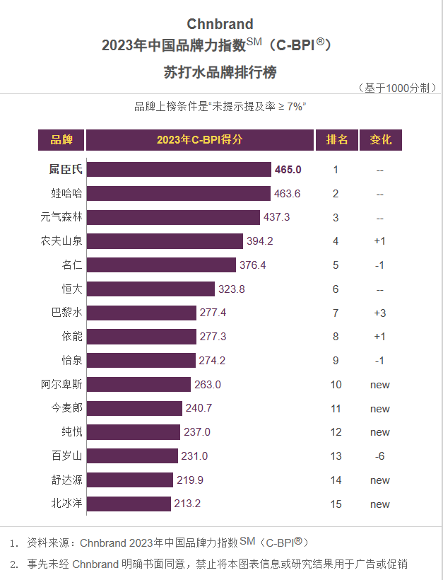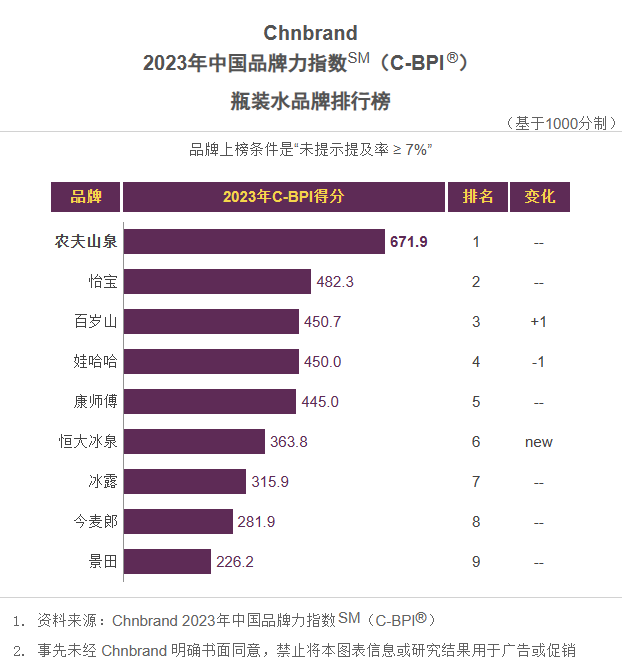 Chnbrand 2023年中国品牌力指数SM(C-BPI®)瓶装水品牌排行榜