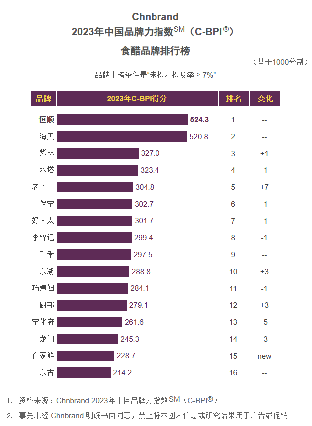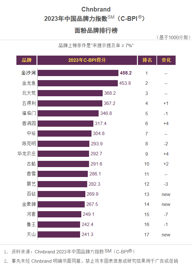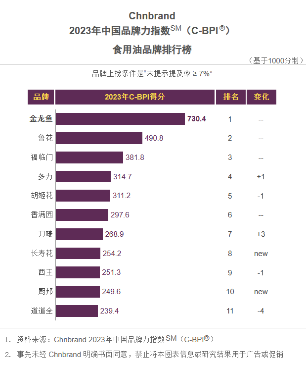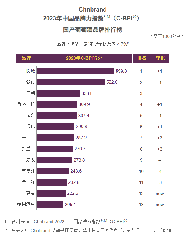 Chnbrand 2023年中国品牌力指数SM(C-BPI®)国产葡萄酒品牌排行榜Chnbrand 2023年中国品牌力指数SM(C-BPI®)高档白酒品牌排行榜中国品牌力指数(China Brand Power Index,简称:C-BPI)是由中国领先的品牌评级与品牌顾问机构Chnbrand实施的中国首个品牌价值评价制度,2011年首次推出并连续数年获得了工业和信息化部品牌政策专项资金的扶持。C-BPI是基于中国消费者对使用或拥有过的产品或服务反馈意见的基础上进行的独立无偏见研究,是测定影响消费者购买行为的品牌力指数,是消费者和企业最信赖的品牌价值评价制度。图片来源:公众号@Chnbrand品牌洞察 封面图来源:Pexels来源:食品饮料行业观察(ID:FoodBevDaily)推荐阅读 点击名称 可阅读原文