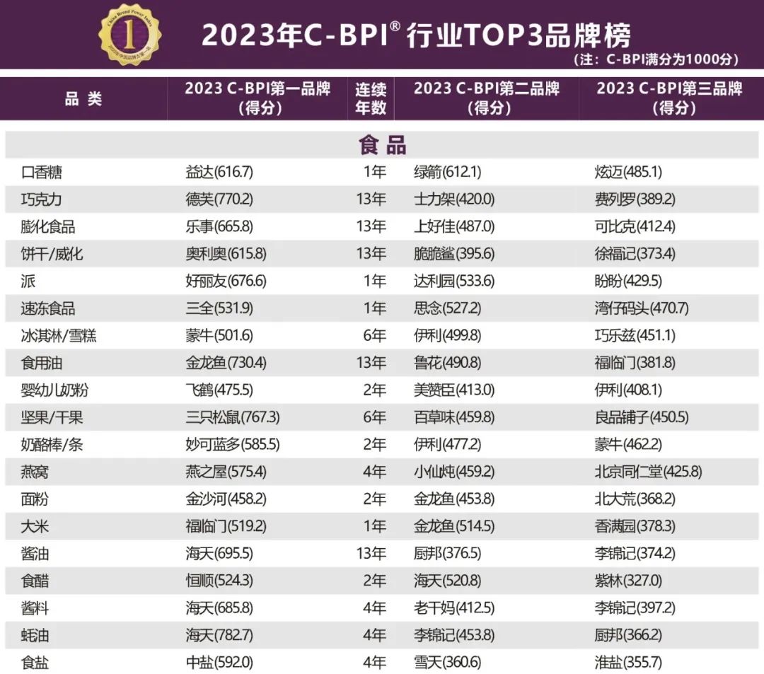 2023年(第十三届)中国品牌力指数SM(C-BPI®)研究成果发布该指数自2011年首次推出后,连续数年获得工业和信息化部品牌政策专项资金的扶持。榜单中食品行业有19个细分品类,并且排出了每个品类TOP3品牌。