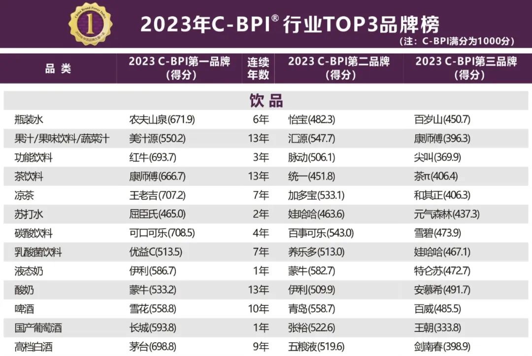 榜单中饮料行业有13个细分品类,以下是每个细分品类TOP3品牌。