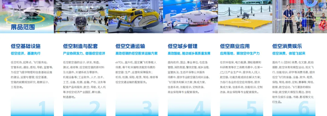 展品涵盖低空基础设施、制造配套、交通运输、城乡管理、商业应用、消费娱乐六大板块