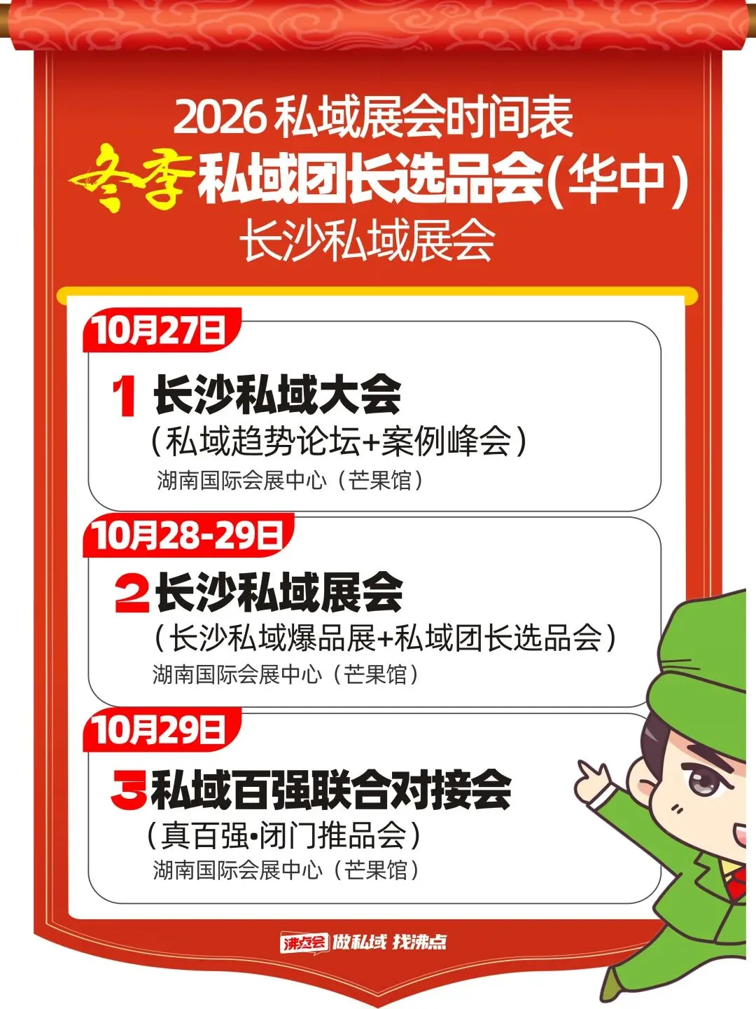 大家好,我是沸点会杨露。这两天,我们正式对外发布2026年度私域展会全攻略,宣布将以北京、广州、长沙三大核心城市为支点,举办覆盖华北、华南、华中的三场大型私域新品发布会,为私域从业者构建全年不间断的资源链接与趋势交流平台。