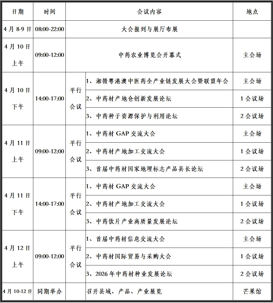 为深入贯彻国务院办公厅《关于提升中药质量促进中医药产业高质量发展的意见》,集中要素解决中药农业端"四缺二难"卡脖子痛点,推动中药材基地与工业企业直接对接与品牌化发展,切实服务全国中药饮片与中成药集采工作,助力乡村振兴与健康中国战略实施,经广泛征求意见并审慎研究,中国中药协会决定将首届中药农业博览会暨首届中药农业产业大会定于2026年4月10日-12日在湖南长沙举行。