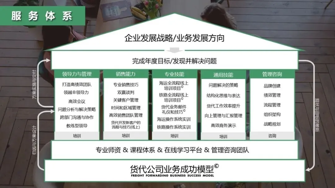 历经五年深耕与打磨,我们自主研发专属国际物流行业的咨询模型与培训体系:精准诊断企业经营痛点,提供可落地的定制化解决方案;覆盖企业各层级员工,打造针对性培训课程,全方位提升从业人员专业素养,夯实企业发展根基。