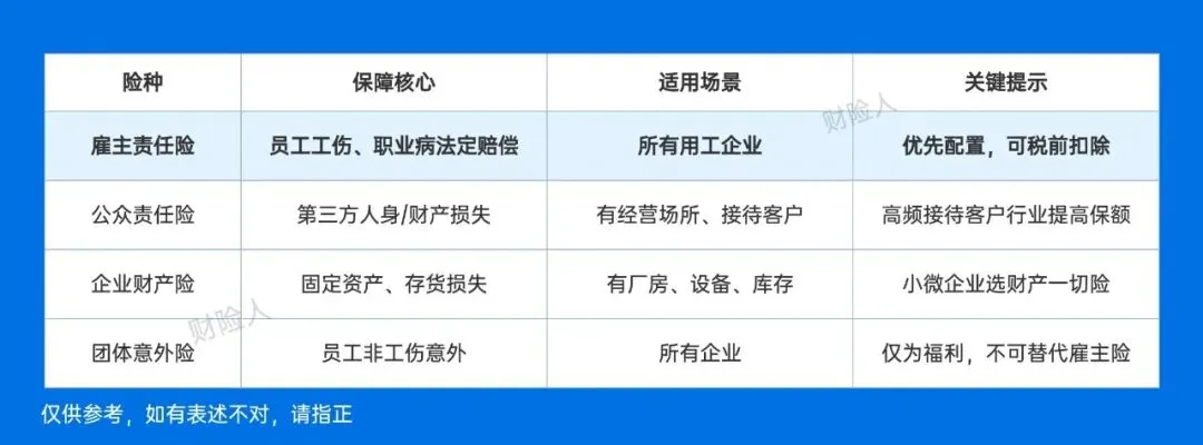 企业在经营过程中风险是无处不在的,员工工伤、设备损坏、客户索赔等,都可能造成重大损失。但是作为经营者,面对一大堆保险险种,根本搞不懂自己需要什么保险,所以就出现,买保险踩大坑,钱都打水漂了。所以今天我就给各位老板整理下,各行业需要买那些保险,这些保险又都是保障什么内容的,让你一次看懂,只买对的,不买错的!覆盖行业:矿山、危化品、建筑施工、交通运输、渔业等,核心必保「安全生产责任保险(安责险)」。保障:覆盖所有从业人员(含临时工)。保身故伤残、员工医疗、第三者损失、事故救援及法律费用。投保:开工前(很重要)向保险公司投保,保费从企业安全生产费用列支,不得退保、延迟续保,费率按风险动态调整。① 建工一切险/安装一切险:保工程本体、材料、设备因灾害/意外损失,含第三者责任;(现在不少建筑工程也要求必须买该保险)。② 建工团意险:不记名,保施工人员意外;(现在不少建筑工程也要求必须买该保险)。③ 雇主责任险:转移员工工伤法定赔偿,可税前扣除。核心风险:财产损失、员工工伤、产品纠纷,必配3类+补充险种。1. 企业财产一切险:保厂房、设备、存货因火灾、盗窃等损失,可附加机器损坏、营业中断险(足额投保,避免比例赔付);(需找线下保司核保)。2. 雇主责任险:必备,保员工工伤、身故伤残、意外医疗、误工费、职业病等等,可税前扣除;3. 产品责任险:出口企业必配,保产品缺陷致第三方损失;4. 团意险:补充员工非工伤意外身故伤残、意外医疗、住院津贴(不可替代雇主责任险)。投保:提供资产、员工数、产值,财产险、产品险需联系财险公司定制,雇主责任险、团体意外险线上线下均可直接投保。覆盖:餐饮、酒店、商超、物流等,核心防第三方纠纷和财产损失。① 公众责任险:保顾客在店内摔伤、食物中毒等损失;投保:车辆险线上线下均可,货运险按货物价值、路线投保。1. 网络安全险:保黑客攻击、数据泄露、勒索病毒相关损失;(需找保险公司单独询价投保)2. 知识产权侵权险:保专利、版权侵权的法律费用和赔偿;(需找保险公司单独询价投保)4. 董监高责任险:上市公司/拟融资企业必配,保董监高决策失误相关诉讼损失。1. 出口信用险:政府支持,保买方违约、政治风险致损失(需提前申请信用限额);投保:出口信用险找中国信保,按订单金额投保;货运险按货物价值投保。总结:企业保险核心是“按需配置、足额投保”,建议咨询专业人士定制方案,避免花冤枉钱。愿每一家企业都能稳健前行!
