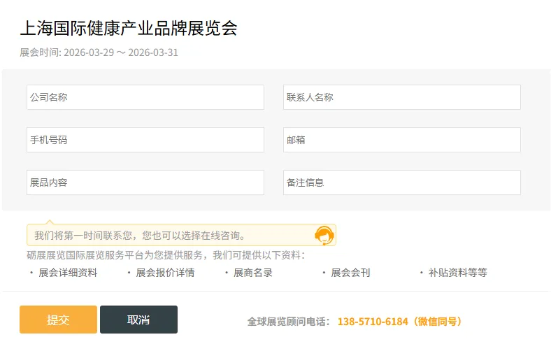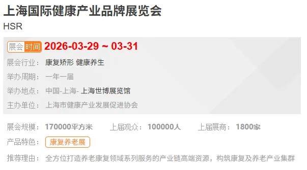 上海国际健康产业品牌展览会(HSR)由上海市健康产业发展促进协会、中国非处方药物协会及上海市健康促进中心主办。作为大健康系列展重要板块之一,将聚焦养老服务、养老地产、宜居建筑、康养服务、辅具设施、康复医疗、健康管理等板块。汇集国内外产业领军企业,全方位打造养老康复领域系列服务的产业链高端资源,构筑康复及养老产业集群。