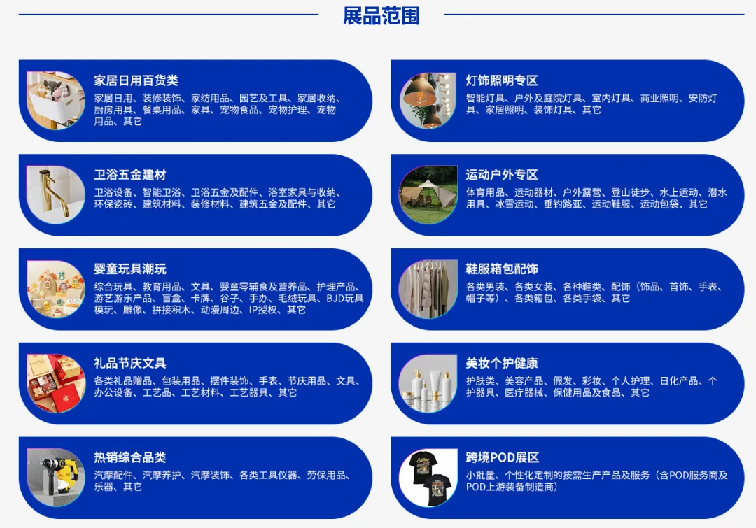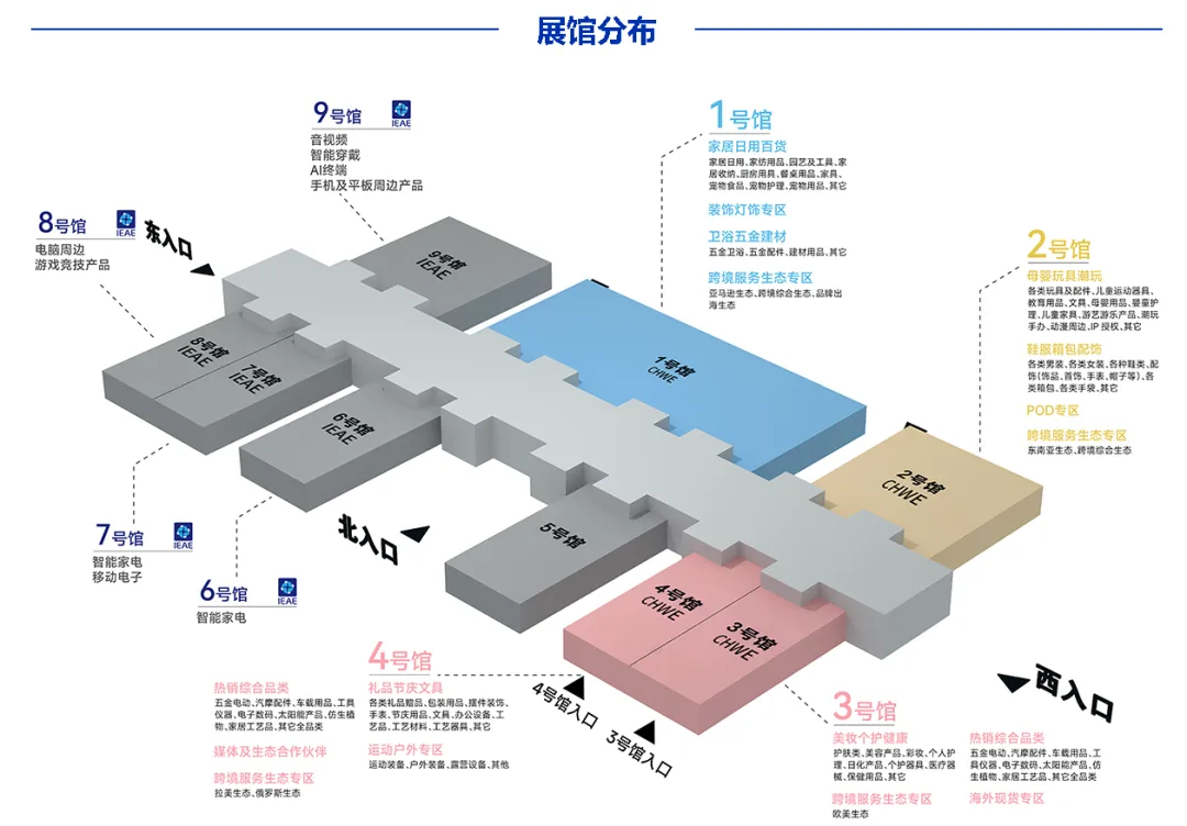 本届 CHWE 规模全面升级,展览面积突破 10 万平方米,较往届扩容 30%,集结3800+源头工厂,涵盖15+主流品类,从3C电子、家居户外到美妆个护、服饰鞋包,再到宠物用品、母婴玩具等热门赛道,实现“一站式选品”。通过8大主题馆构建高效对接平台,旨在链接中国供应链与全球市场,助力“中国智造”开拓国际新赛道,抢占年度出海先机。
