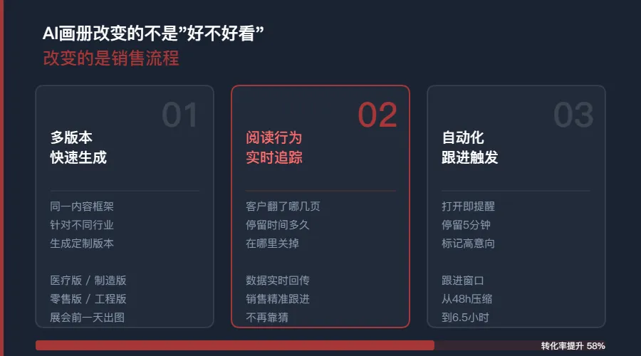 准确说,AI画册做的事情,是把一份静态的宣传物料,变成一个会收集数据、会反馈行为、会触发跟进的销售工具。