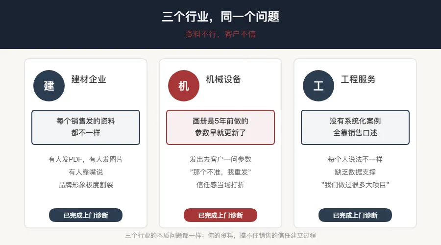 三个行业,三个问题,本质都是同一件事:你的资料,撑不住销售的信任建立过程。
