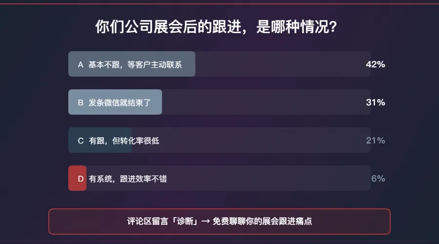 参展三年,每年花10万以上在展会上,但销售跟进完全靠个人经验。有的销售发PDF,有的发微信图片,有的压根不发靠嘴说。客户体验完全不一致,品牌形象很割裂。