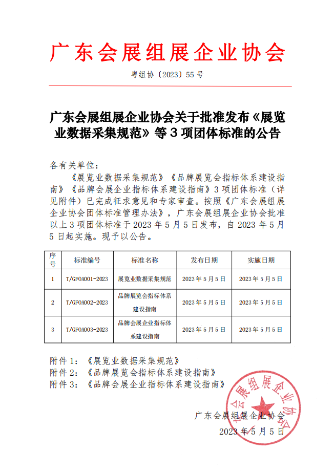 广东会展组展企业协会关于批准发布《展览业数据采集规范》等3项团体标准的公告