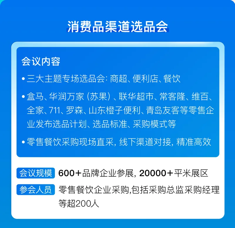 展商类别:休闲食品、日用百货、蔬果生鲜等