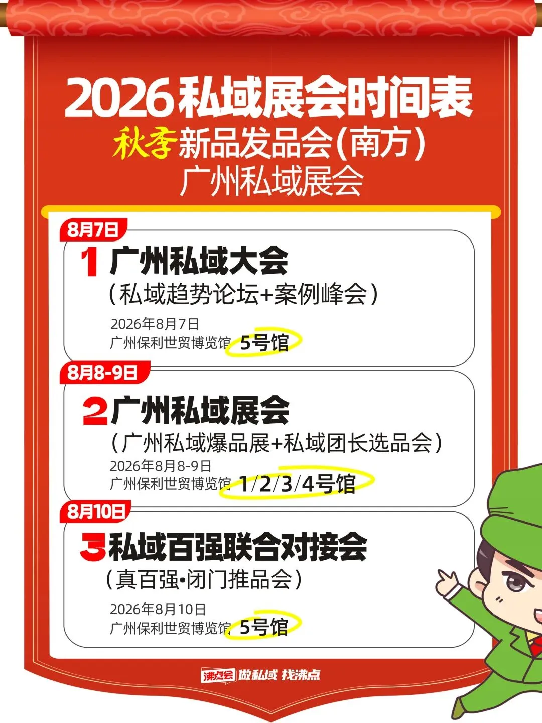 8月8-9日 | 广州私域展会 | 私域爆品展+私域团长选品会,覆盖生鲜、日用、美妆等全品类,精准匹配私域选品逻辑 | 1/2/3/4号馆 |
