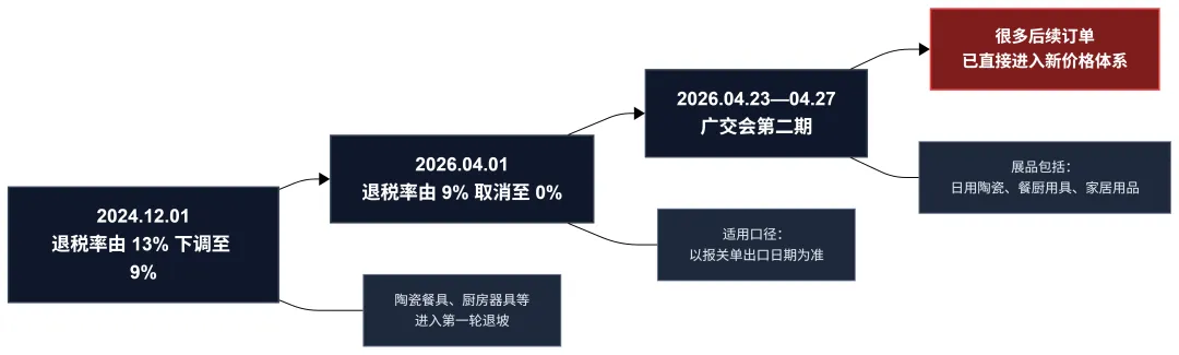 一个月之后,第 139 届广交会第二期将于 2026 年 4 月 23 日—27 日 举行,展出内容就包括日用陶瓷、餐厨用具、家居用品。与此同时,相关产品的出口退税政策已自 2026 年 4 月 1 日 起发生变化。也就是说,这次展会上谈下来的很多订单,一开始就会落在新的价格体系里。