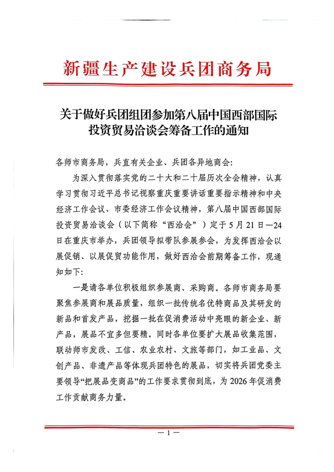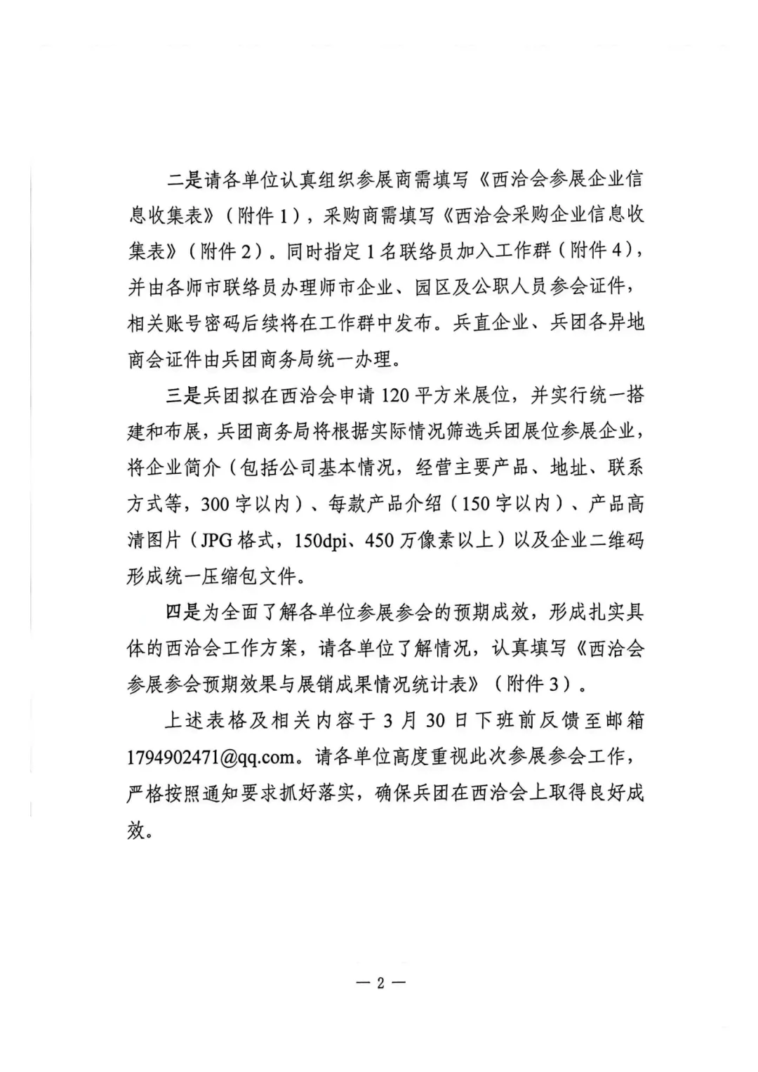 届时,兵团将组织园区、企业参展参会,请有意向参展的园区或企业,于3月30日前填写报名表并发送至指定邮箱18097654622@163.com。如有疑问,请联系协会秘书处0991-6611035。兵团商务局关于西洽会具体通知及内容如下: