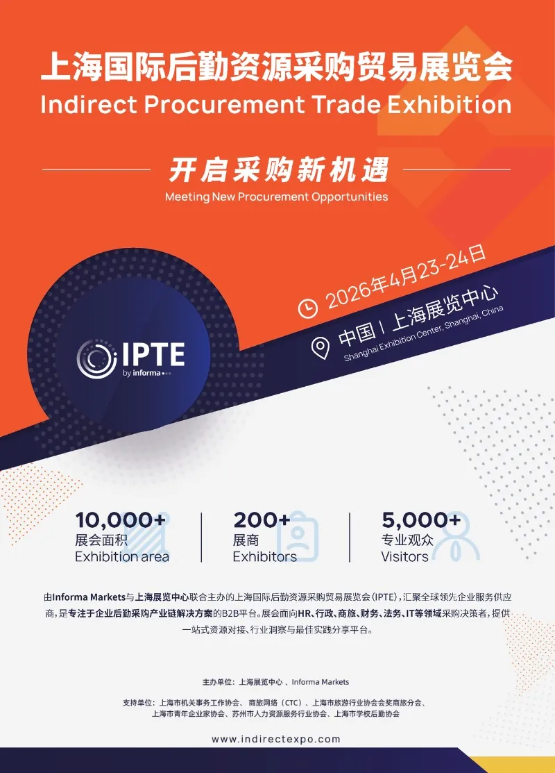 由Informa Markets(英富曼企业管理(上海)有限公司)与上海展览中心联合主办,上海市机关事务工作协会等单位提供支持的首届上海国际后勤资源采购贸易展览会(IPTE),将于2026年4月23-24日在上海展览中心盛大举办。自即日起,本号将持续报道本次展会相关信息。