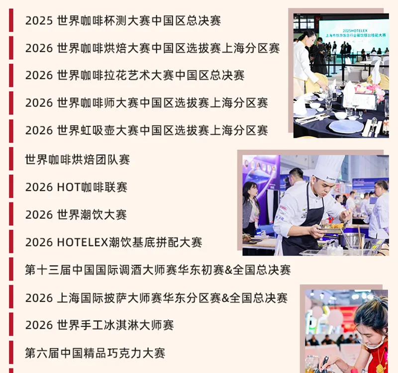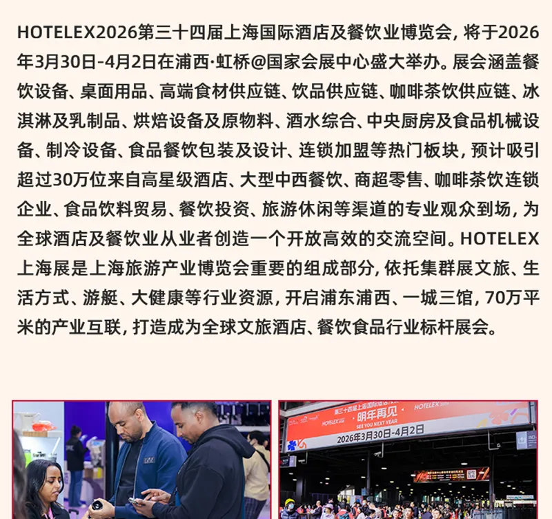 HOTELEX 2026第三十四届上海国际酒店及餐饮业博览会,将于2026年3月30日-4月2日在上海浦西·虹桥@国家会展中心盛大举办!涵盖餐饮设备、桌面用品、食品饮料、咖啡茶饮、烘焙冰淇淋、轻餐美酒、食品机械、食品餐饮包装及机械、连锁加盟等热门板块,为全球酒店及餐饮业从业者创造一个更为开放和高效的交流空间。