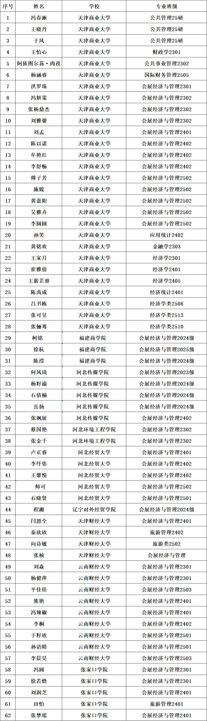 项目组发布《第三期“弘毅研学计划”跨校招募学员——天津商业大学“会展+”拔尖人才培养新探索》推文以后,得到了各兄弟院校的大力支持和广大学生的积极响应。本期研学计划共招募学员62人,天津商业大学28人,来自8所兄弟院校的会展及相关专业学生34人。项目组现将拟录取名单进行公示。按照招募通知,项目组对来自天津商业大学本校的报名学生进行了面试,对来自兄弟院校的学生报名材料进行了审核,最终确定第三期“弘毅计划”拟录取名单。其中,天津商业大学的学员28人,分别来自公共管理、会展、旅游、经济、金融、统计等9个专业。兄弟院校的学员34人,分别来自福建商学院、河北传媒学院、河北环境工程学院、河北经贸大学、辽宁对外经贸学院、天津财经大学、云南财经大学、张家口学院等8所高校。同时。本名单公示3个工作日,如有疑义,请联系hyyxf2026@163.com。第三期“弘毅计划”拟录取名单
