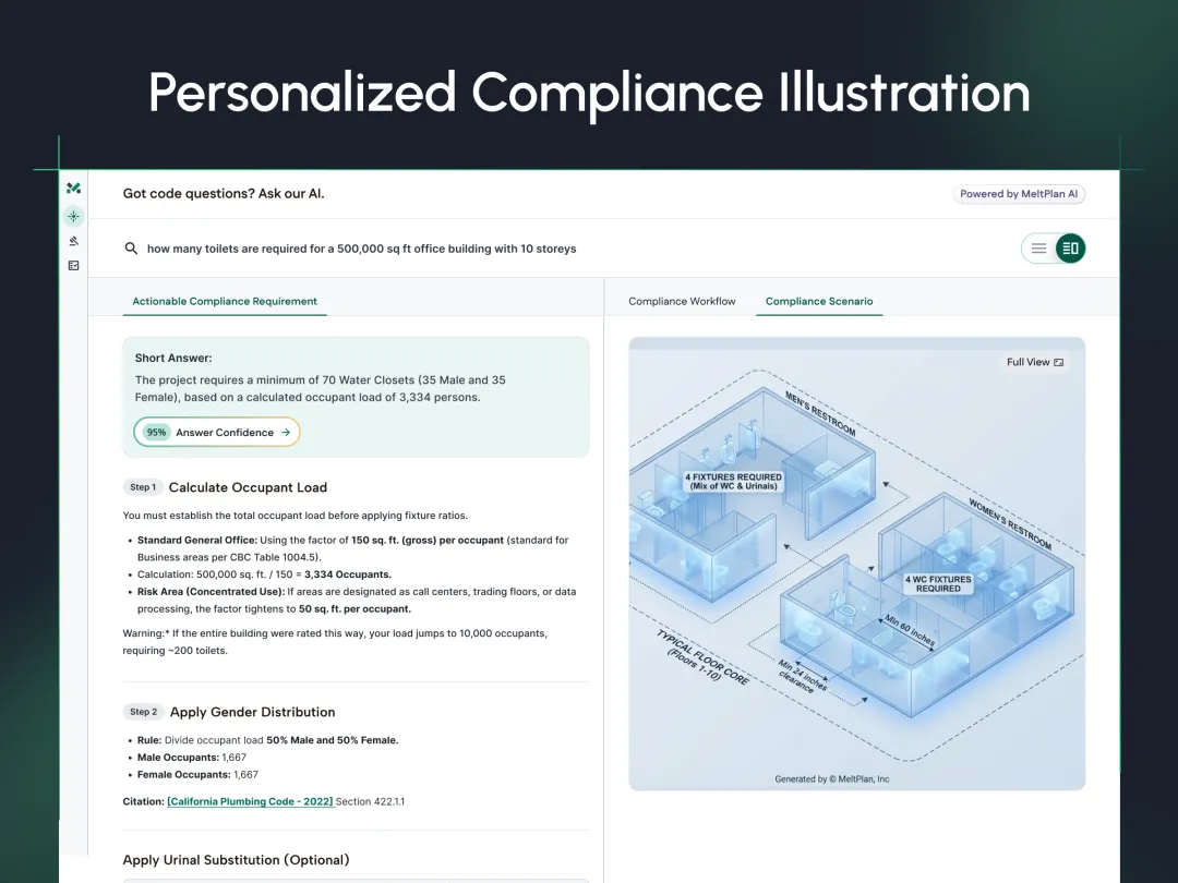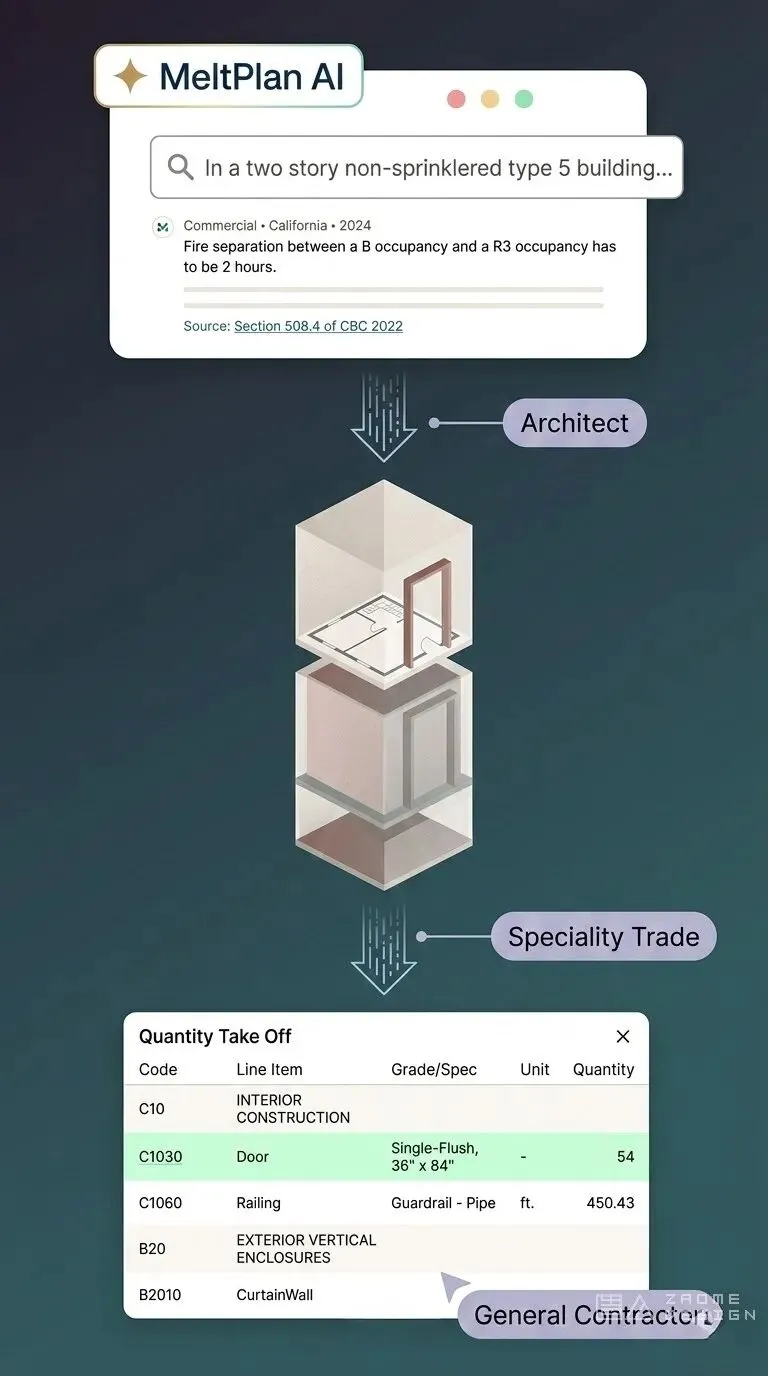 值得注意的是,MeltPlan 并未采用通用AI工具简单“适配建筑行业”,而是构建了一个原生面向建筑领域的AI系统。该系统能够理解建筑规范、材料体系、施工顺序、采购逻辑以及建造方法等专业知识,并已在建筑检查员考试测试中取得 95%以上的成绩。
