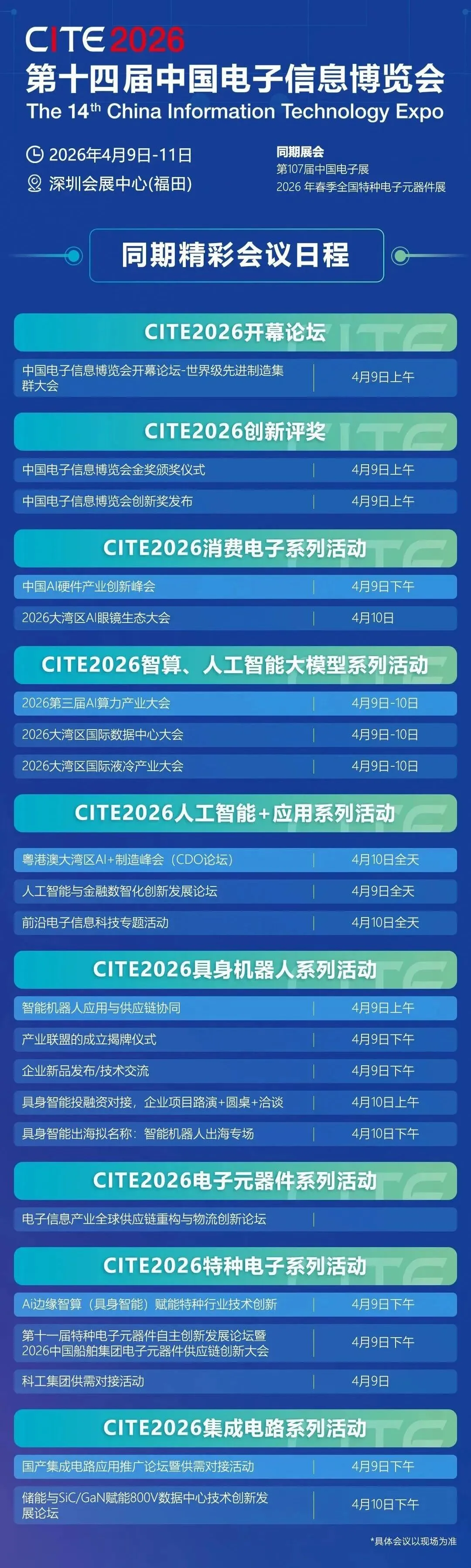 随着深圳“十五五”规划重磅出炉,加快新一代信息技术、新能源、高端装备、新材料、低空经济、航空航天等战略性新兴产业集群发展,扩大智能终端、网络与通信、智能网联汽车、集成电路、全屋智能等产业优势,全球电子信息产业的目光再次聚焦深圳。备受瞩目的第十四届中国电子信息博览会(CITE2026)将于2026年4月9日至11日在深圳会展中心(福田)隆重举行。本届博览会同期将举办第107届中国电子展、2026春季全国特种电子元器件展,三展联动,共同打造一场覆盖电子信息全产业链的科技盛宴。