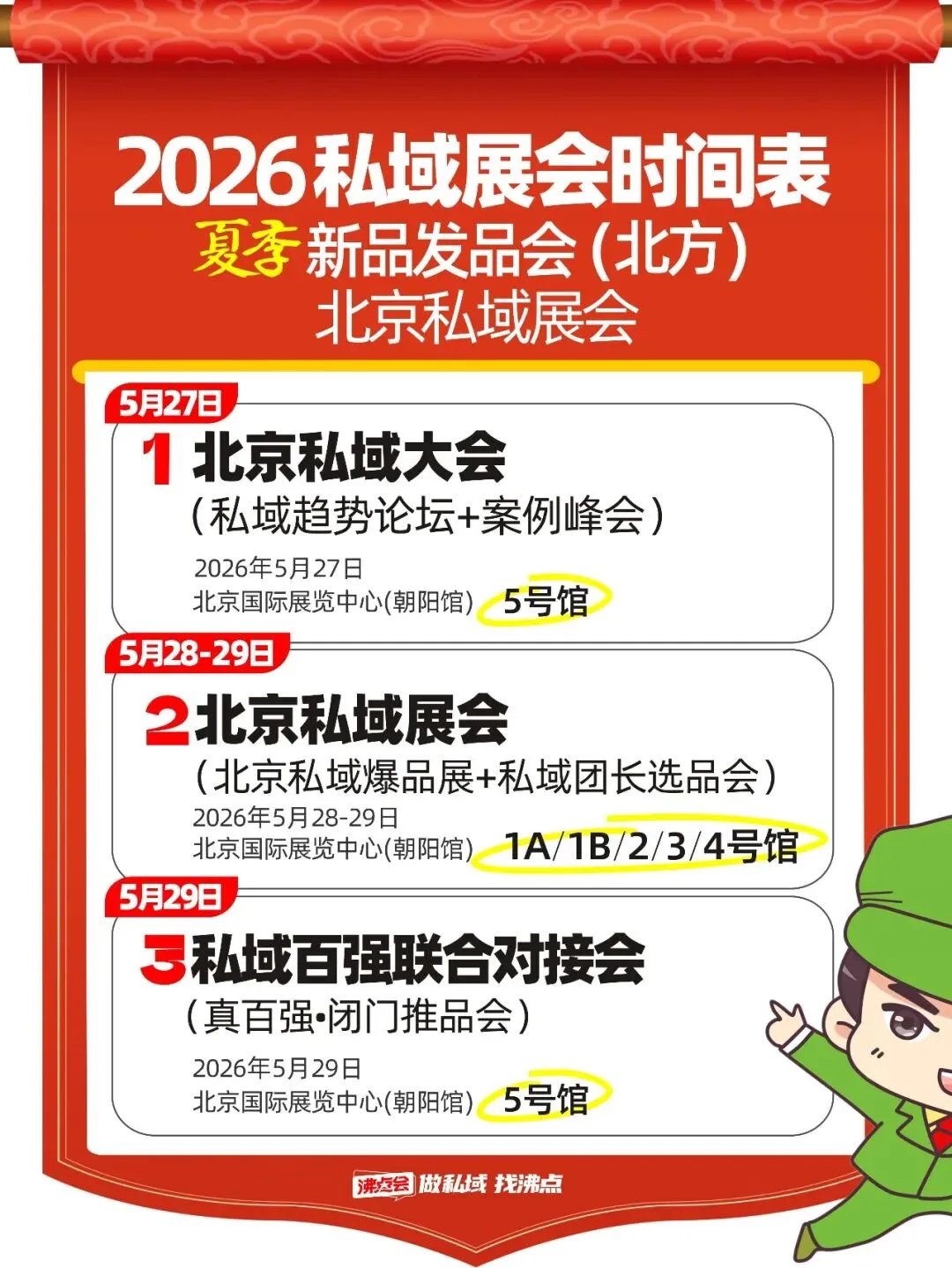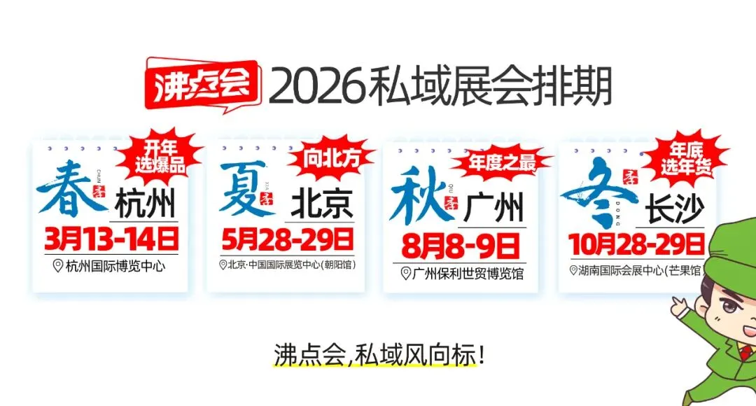 由沸点会重磅主办的2026年私域展会,全新布局北方(北京)、南方(广州)、华中(长沙)三大核心区域,以季节为节点打造三场专属新品发布会,活动流程标准化、形式统一化,精准匹配私域从业者的参会需求,助力品牌方、团长、私域渠道高效链接,抢占全年私域商机。