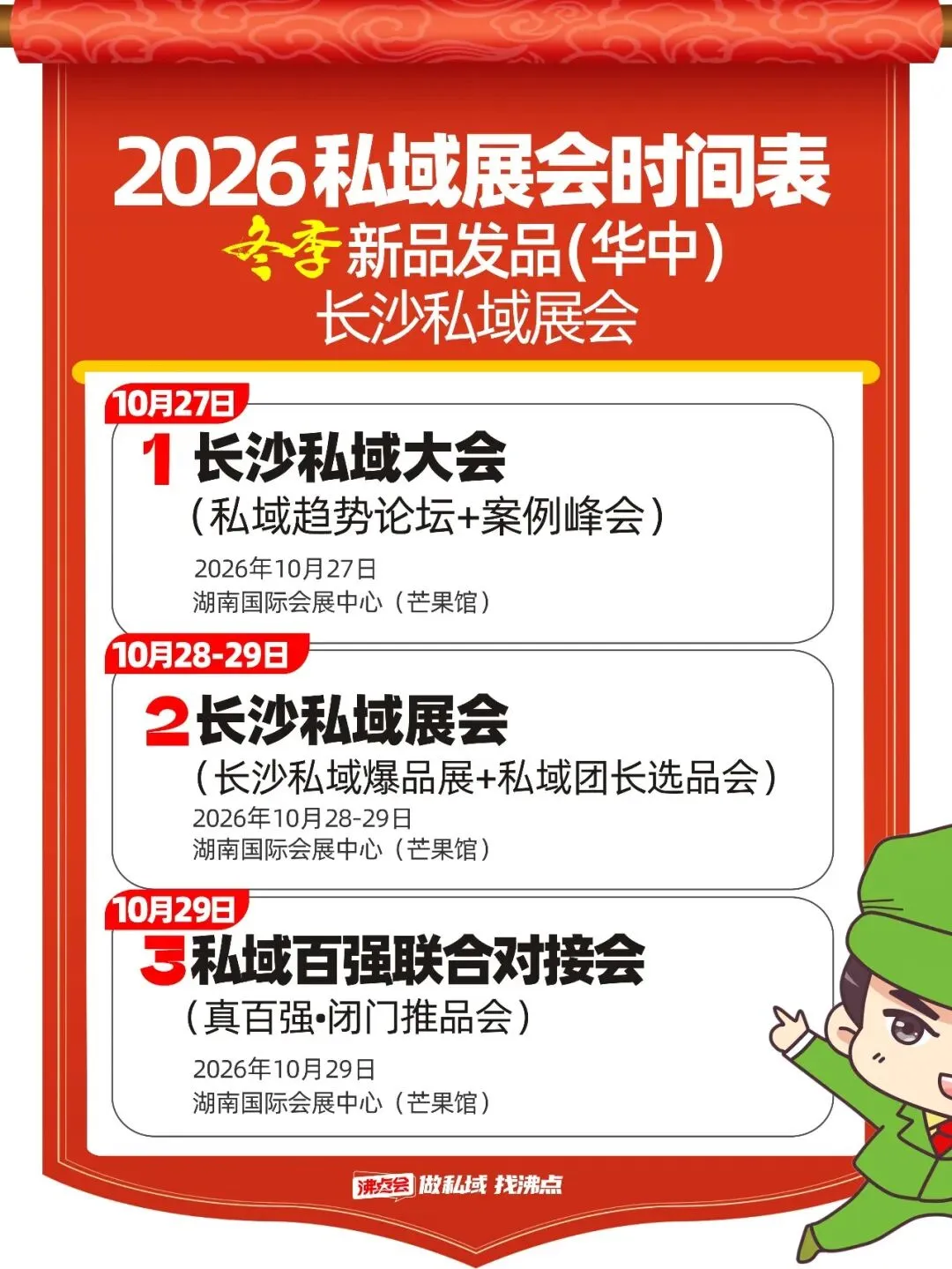 10月28-29日,开展长沙私域展会,涵盖私域爆品展+团长选品会,精准链接华中及中西部渠道资源;