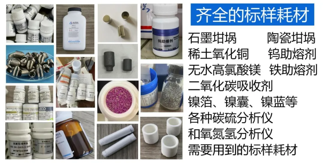 碳硫分析仪专用的实验室标样耗材:碳硫标样、陶瓷坩埚、助熔剂如纯钨、纯铁等、高氯酸镁(吸水剂)、氢氧化钠(二氧化碳吸收剂)、脱脂棉、氧化铜等。氧氮氢分析仪专用的实验室标样耗材:丙酮;无水乙醇;镍篮;镍囊;石墨坩埚;高氯酸镁、碱石棉、氧化铜等。