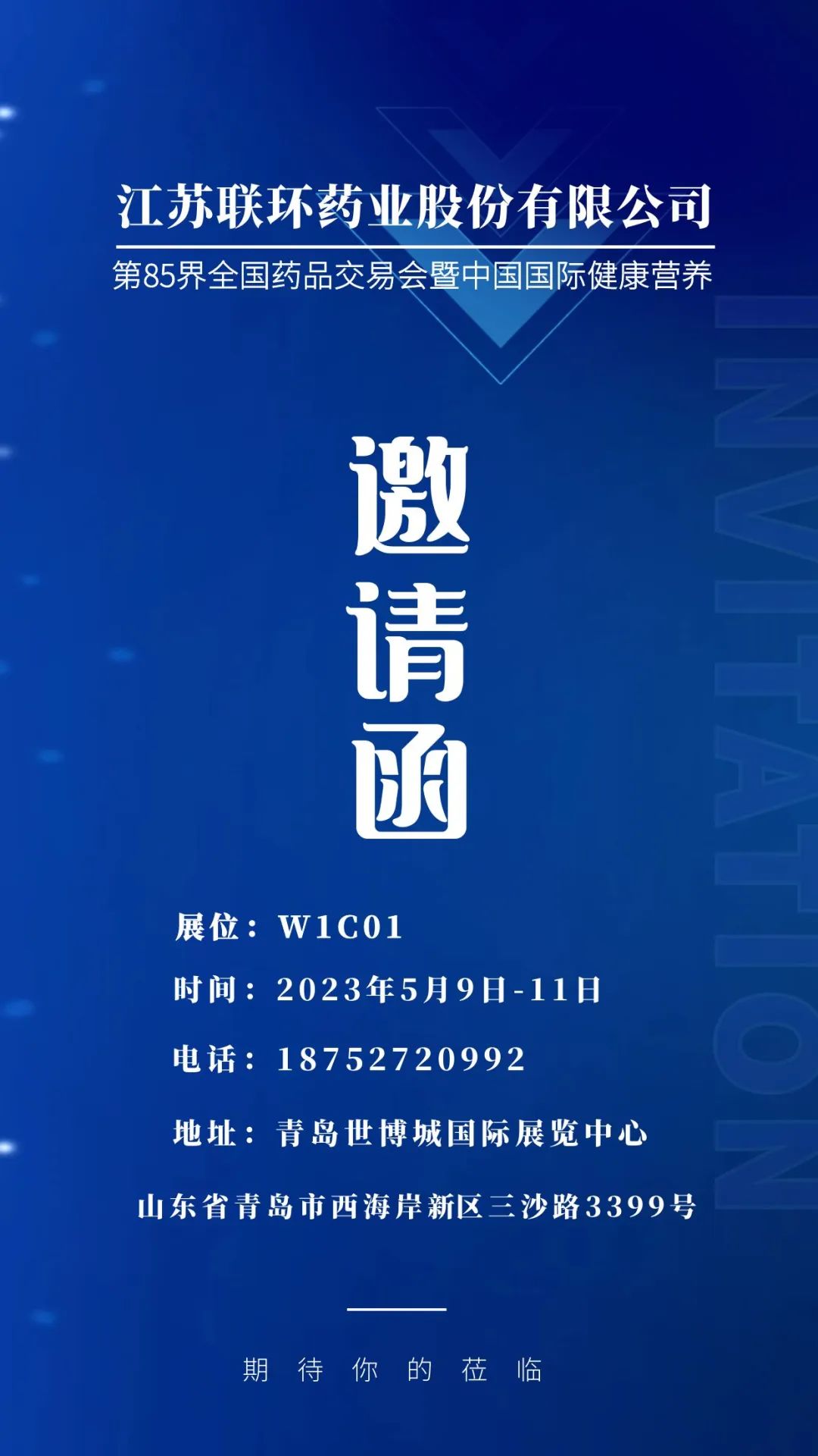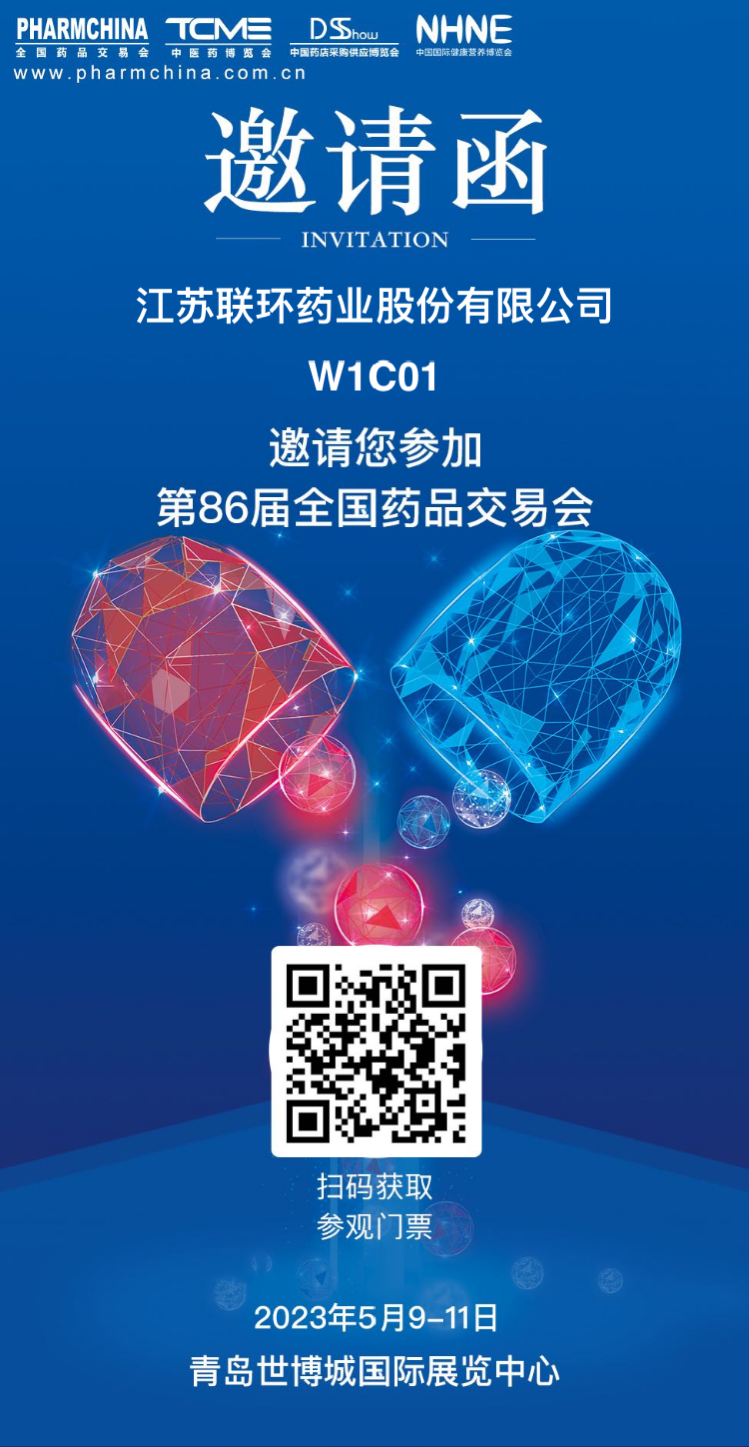 第86届全国药品交易会将于05月09日-05月11日在中国青岛世博城国际展览中心举行。江苏联环药业股份有限公司将携众多重磅产品参展(展位号:W1C01),欢迎新老客户莅临联环药业展位洽谈合作!