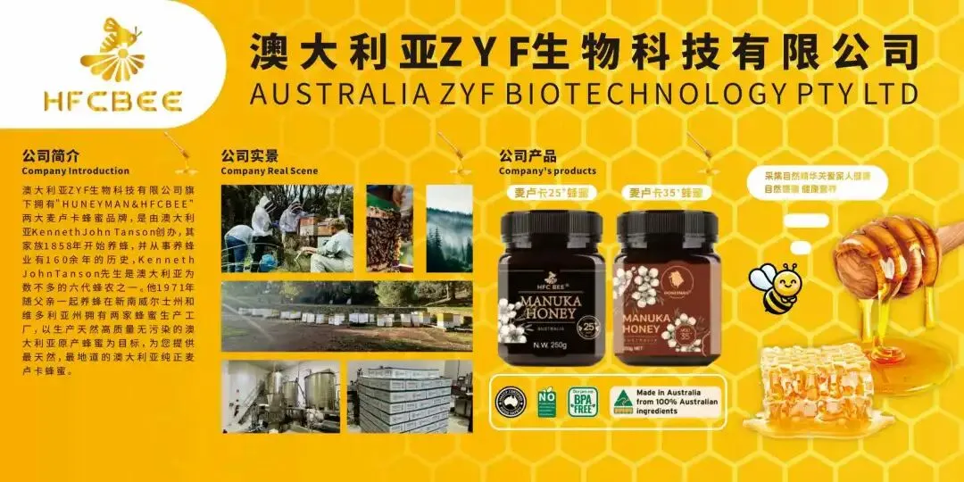 澳大利亚 ZYF 生物科技有限公司,总部位于澳大利亚墨尔本,旗下拥有 ”HFCBEE” 与“HONEYMAN“ 两大麦卢卡蜂蜜高端品牌。自 1858 年起,其家族便投身养蜂事业,传承 160 余年。公司创始人 Kenneth John Tanson 为六代蜂农,在新南威尔士州和维多利亚州设有生产工厂,专注产出天然、高品质、无污染的澳大利亚原产麦卢卡蜂蜜!