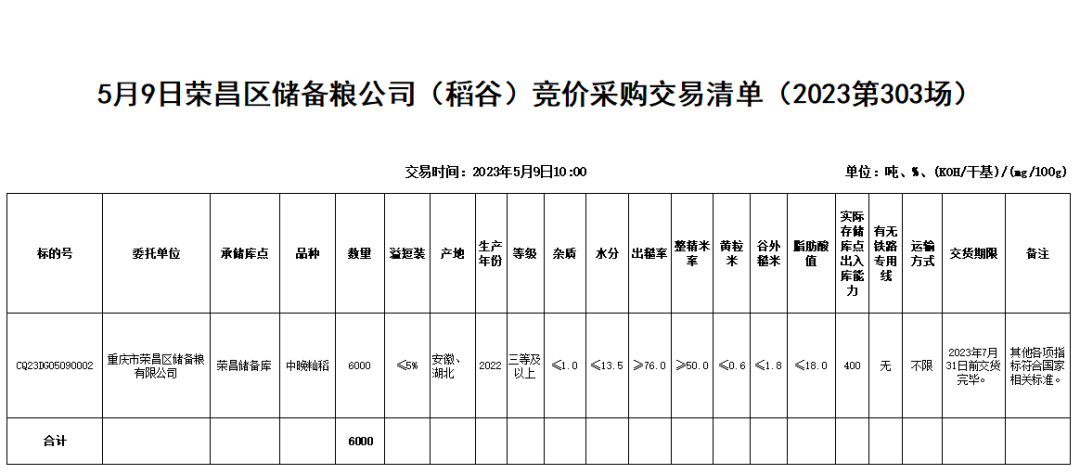 受重庆市荣昌区储备粮有限公司委托,重庆市粮油批发市场有限责任公司(即国家粮食重庆交易中心,以下简称“批发市场”)定于2023年5月9日10:00举办荣昌区储备粮公司(稻谷)竞价采购交易会,现将有关事项公告如下: