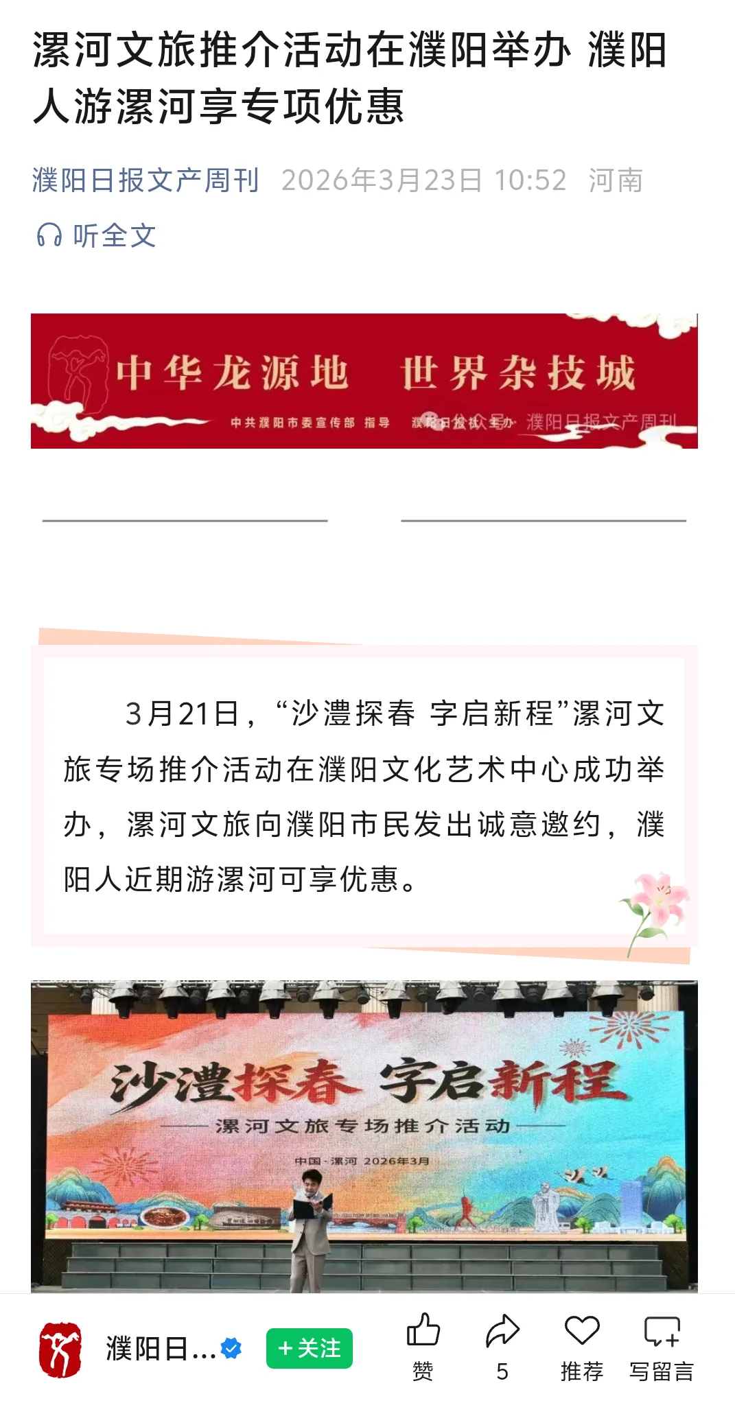 推介会上,景区全面展示核心产品、游玩亮点与优惠政策,郑州、安阳、濮阳地区客户在3月25日至4月3日期间,针对团队免票,仅需每人5元保险费用。郑州、安阳、濮阳三地市的散客在3月25日至4月20日期间,持当地有效身份证件至景区官方售票处可享受景区原价5折优惠,既游览票25元/人,通票60元/人。诚意满满邀三地市游客赴漯畅玩!
